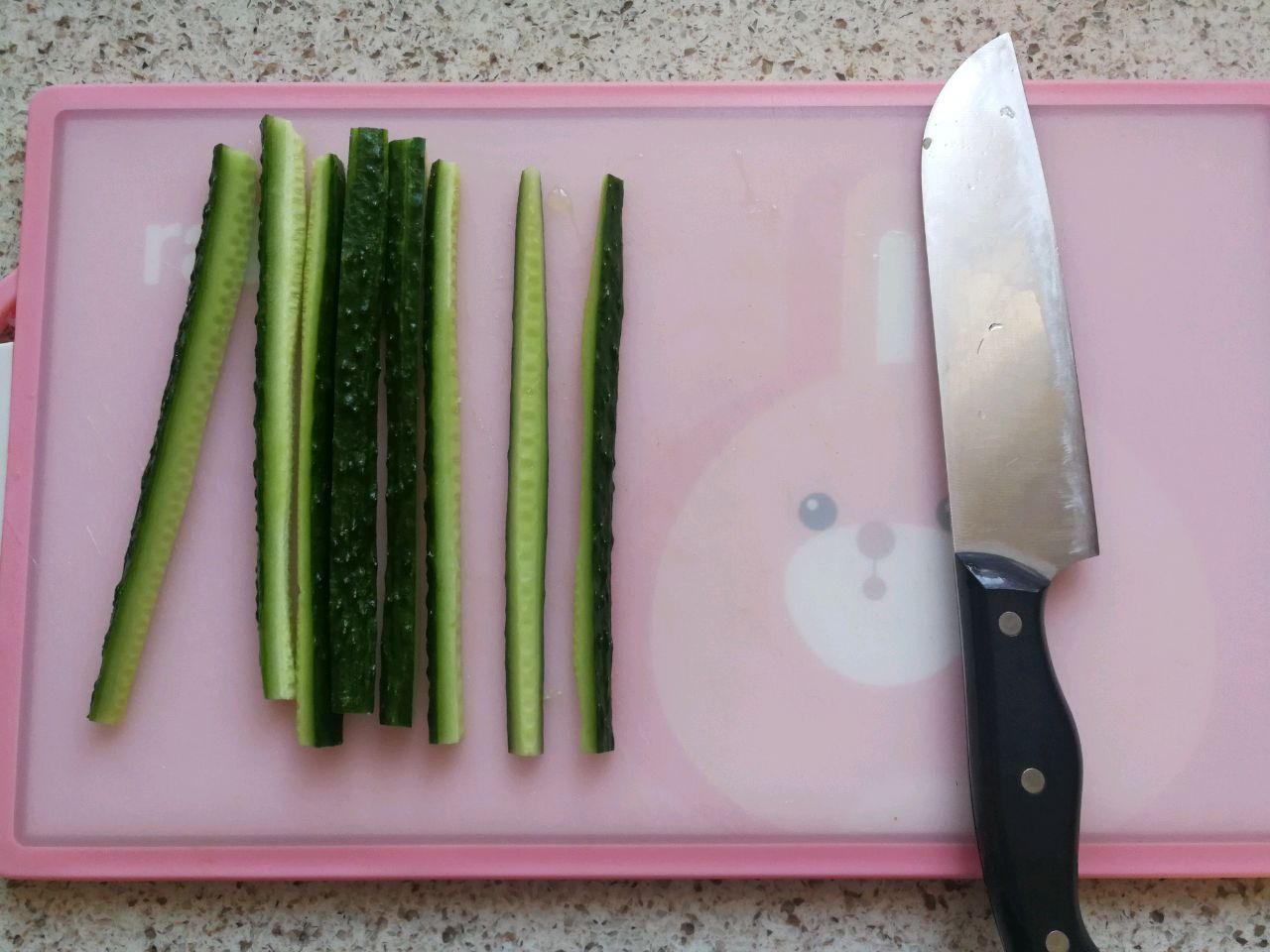 步骤2、把黄瓜改刀切成长条,把里面的籽去掉一些,水份太大卷的时候防止出水。