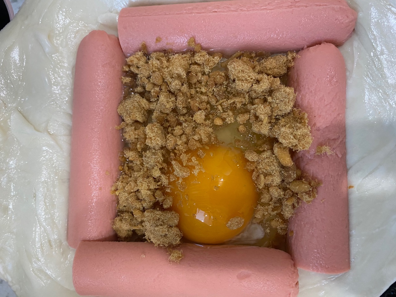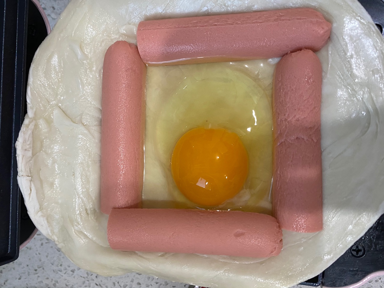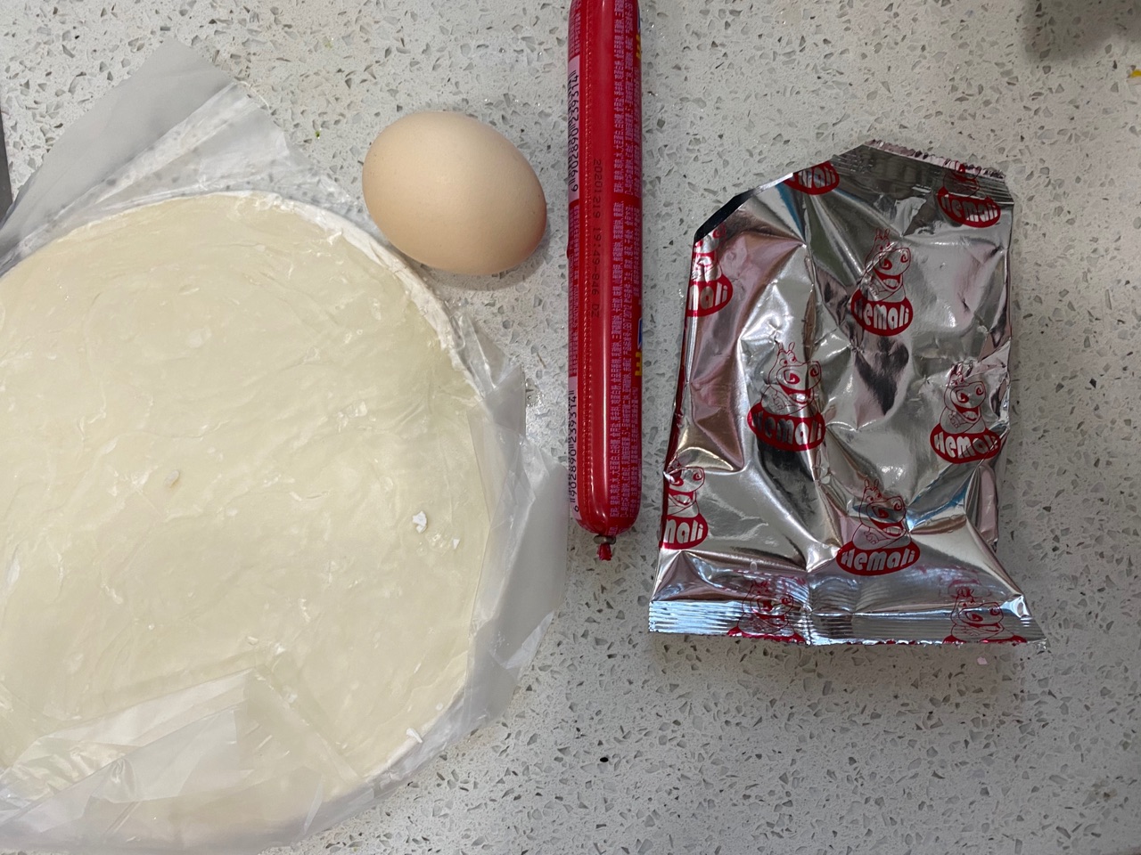 步骤2、手抓饼,鸡蛋,火腿肠,肉松