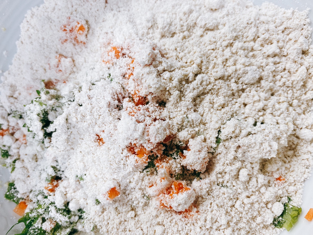 步骤1、蔬菜洗净切碎,我这次用的芹菜叶和胡萝卜碎
