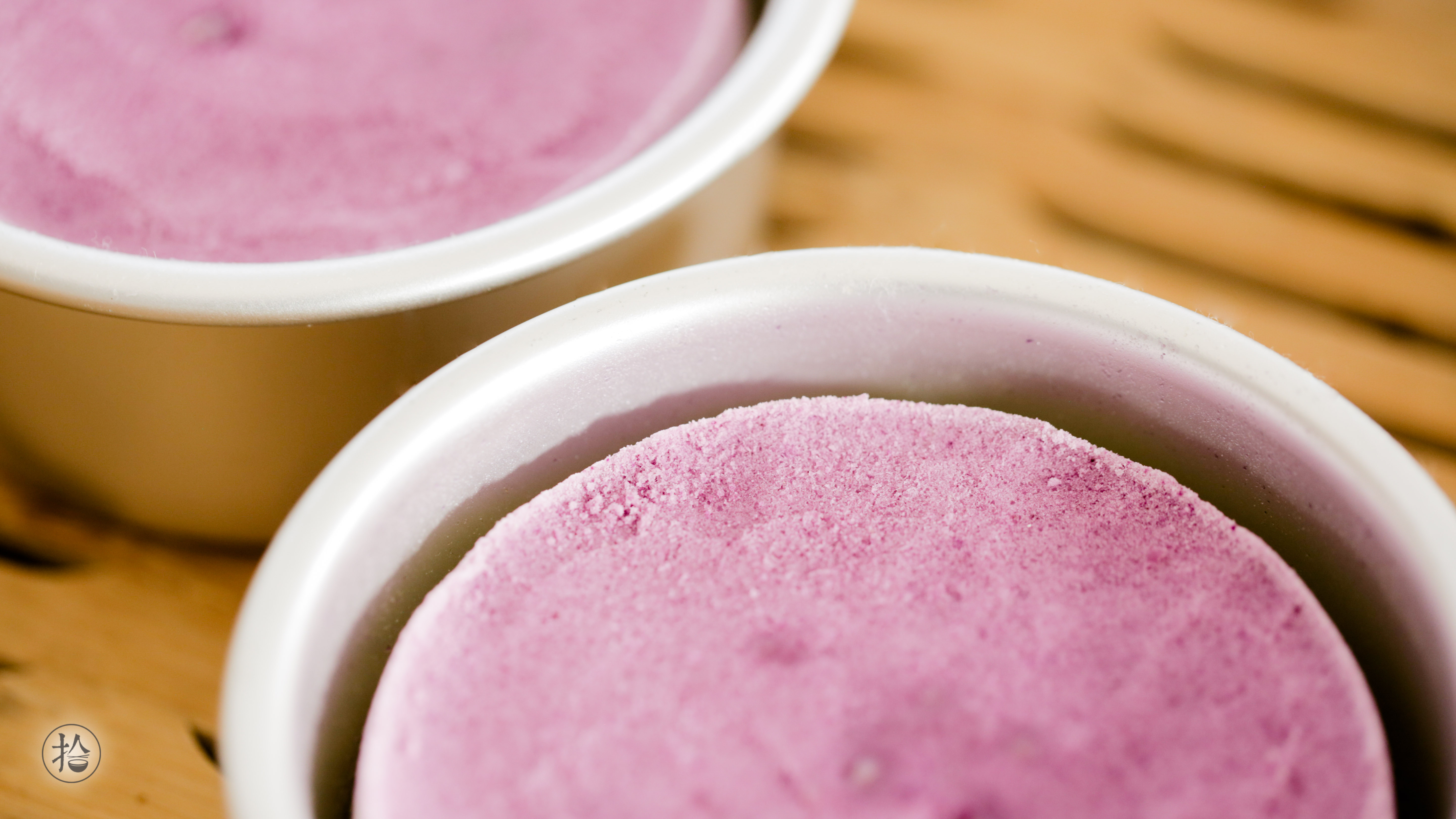步骤7、用勺子将米粉舀入模具中(用4寸蛋糕模具或者磅蛋糕模具)颜色依次为白,黄,绿,紫。用勺子轻轻抹平,不要压实,压太实蒸出来的米糕口感会发粘。