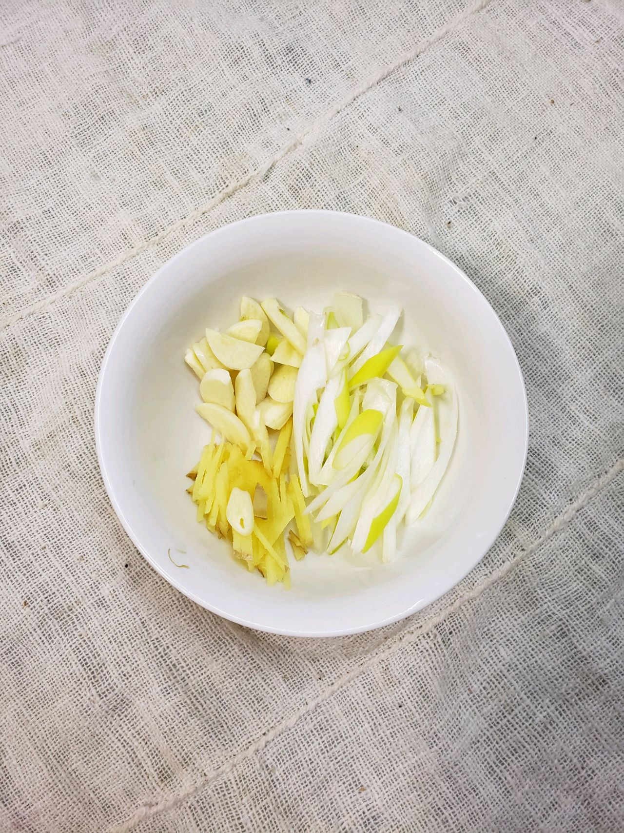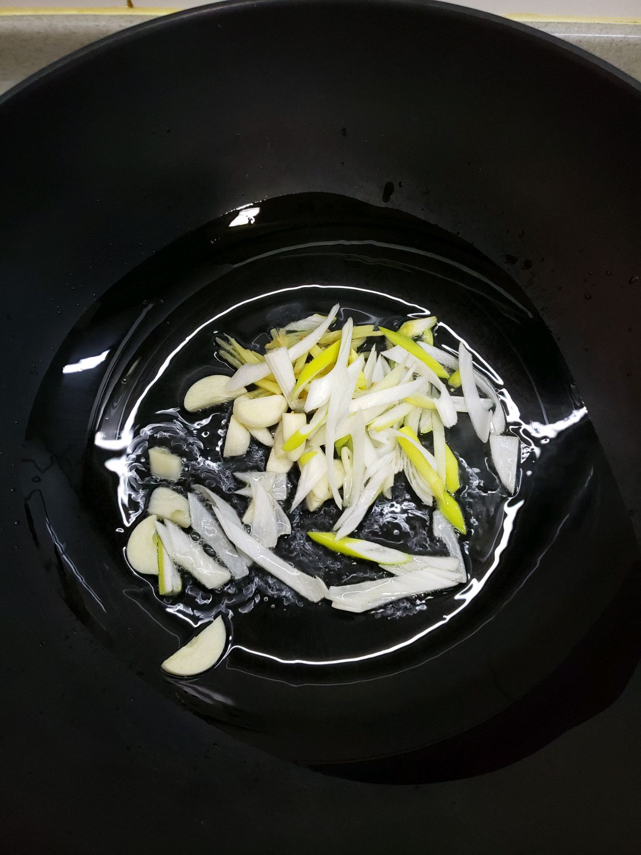 步骤5、热锅凉油,油热放入葱姜蒜,炒香,炒熟。
