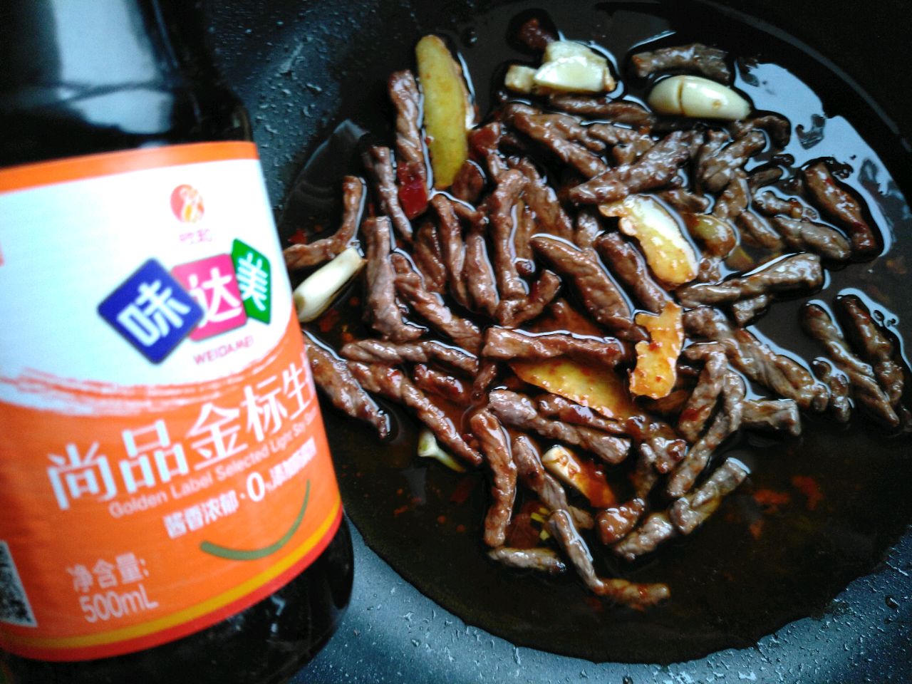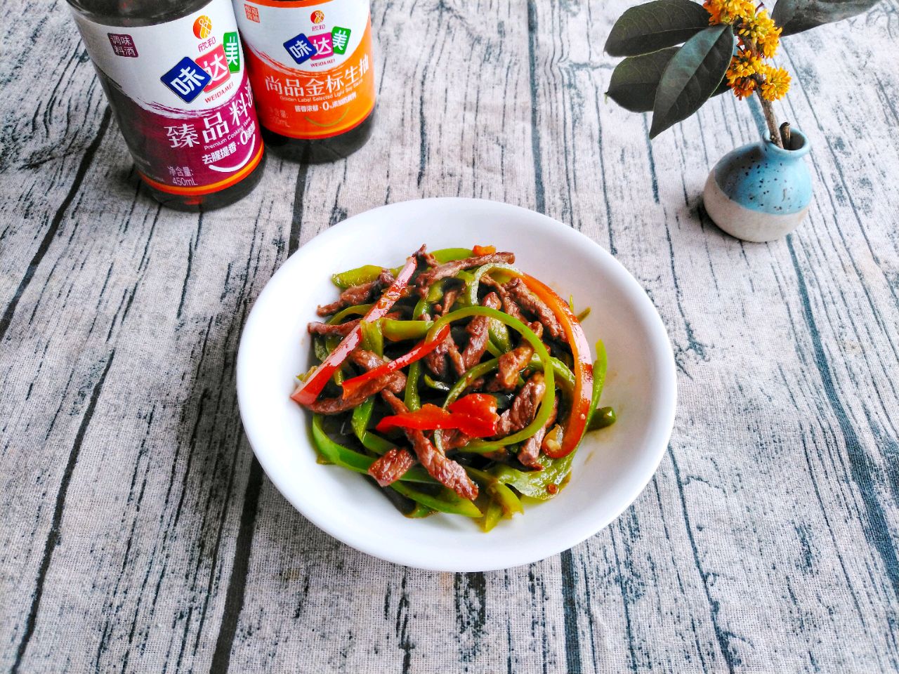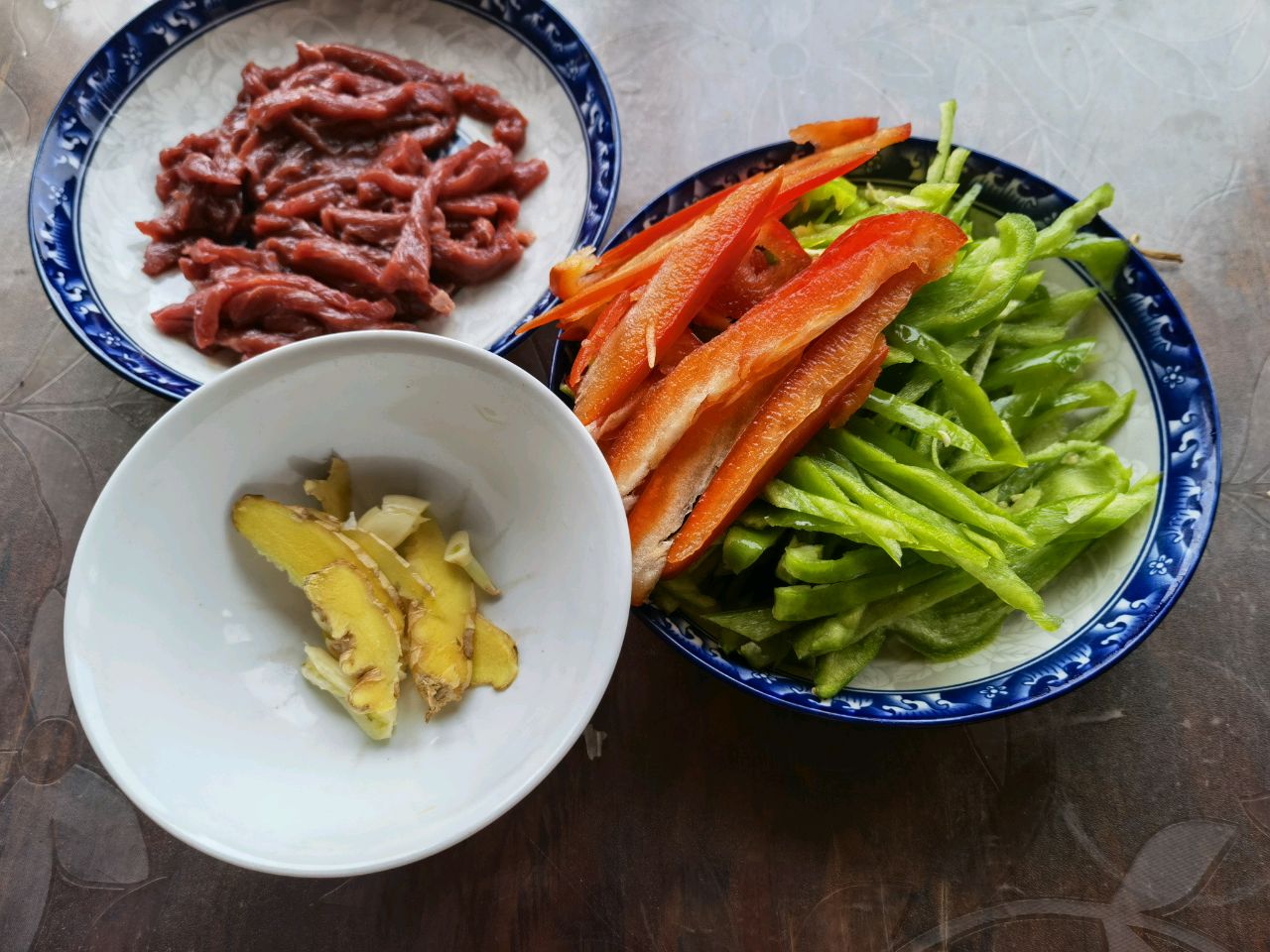 辅料:味达美臻品料酒1勺、青椒3个、姜2片、蒜2瓣、牛肉250克、淀粉1勺