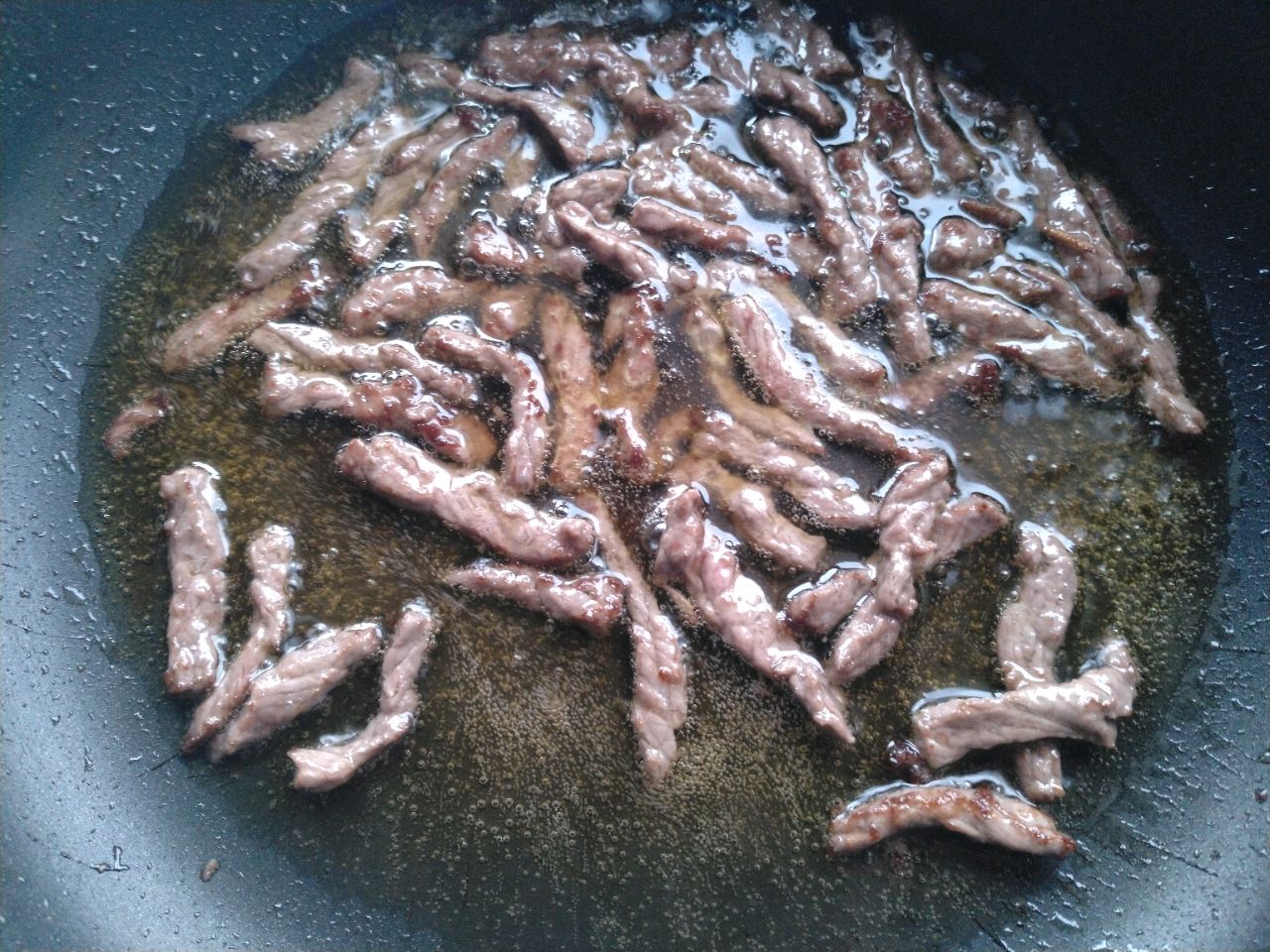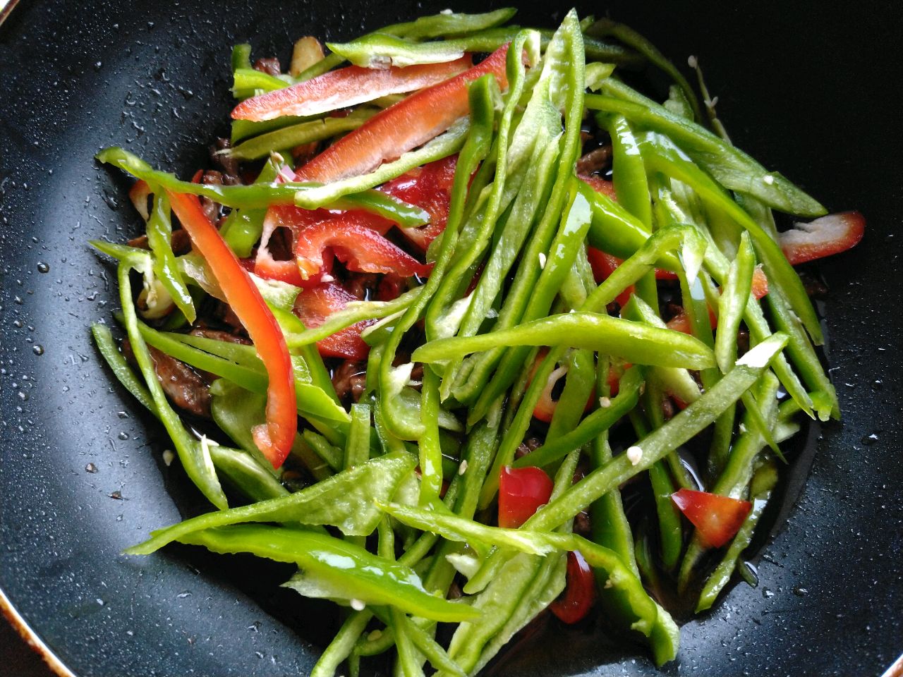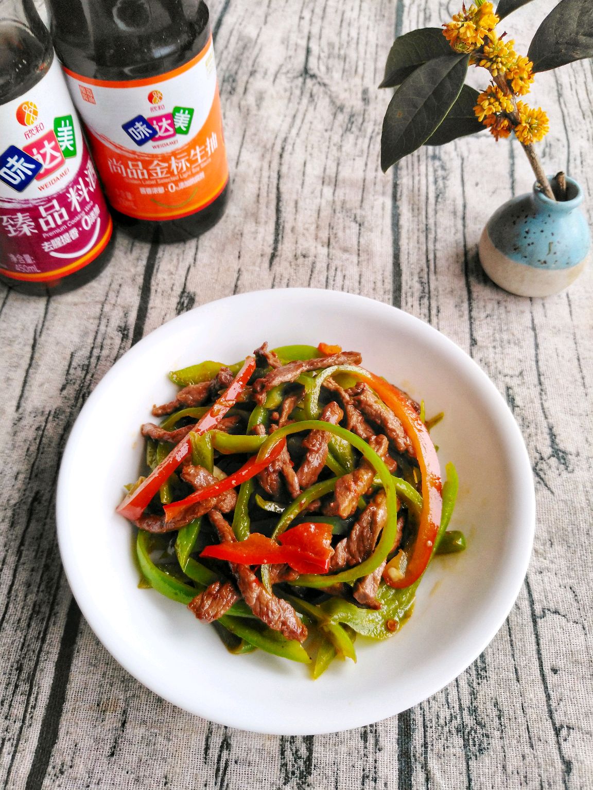 辅料:味达美臻品料酒1勺、青椒3个、姜2片、蒜2瓣、牛肉250克、淀粉1勺