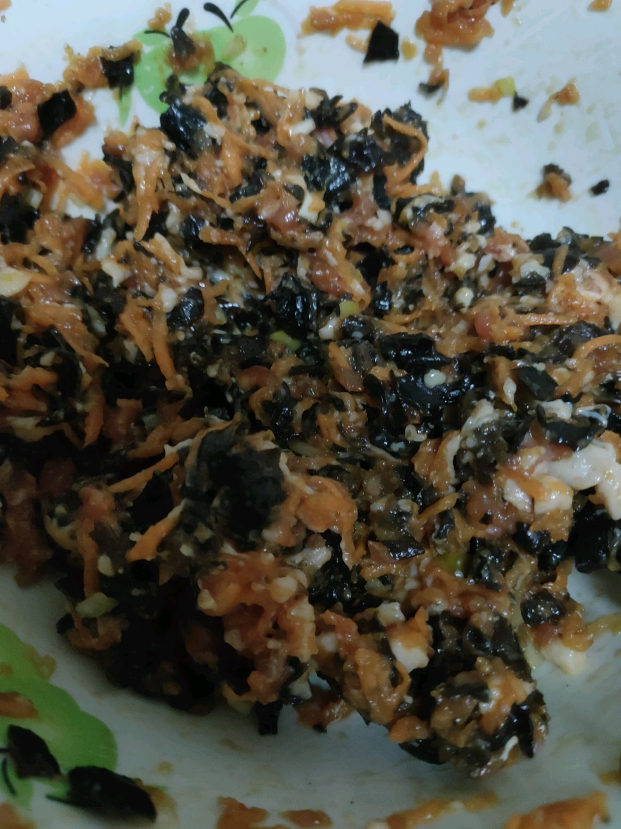 步骤2、猪肉搅成肉馅,加耗油、酱油、十三香、麻油、盐、少许料酒朝一个方向搅匀,木耳泡发切碎,胡萝卜擦细丝一起搅匀