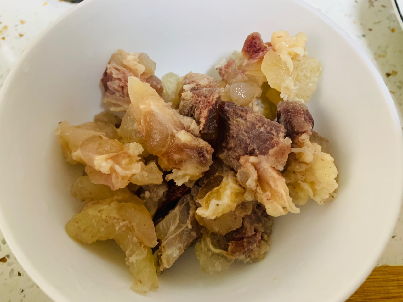 步骤15、锅里的汤水煮开后、放入牛筋和肉片(记得肉片一片片放、以免变成一坨)