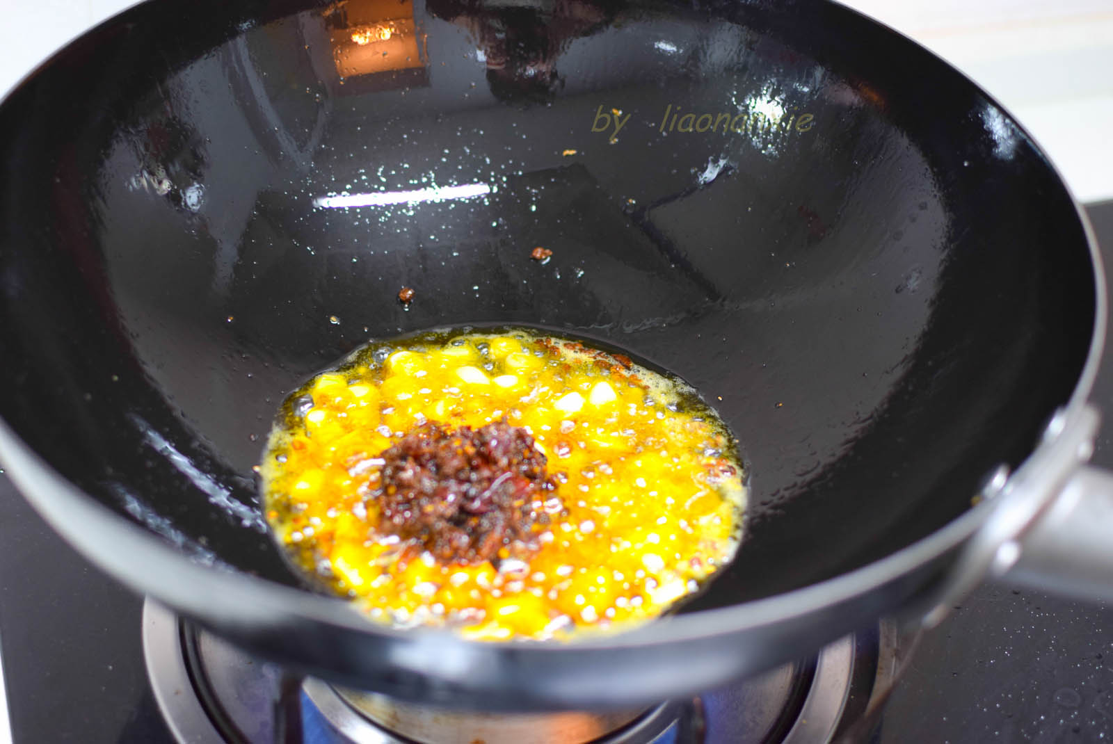 步骤4、炒锅倒油,别等油太热,下入葱姜蒜碎、干辣椒和干花椒炒香,加上两勺水煮鱼调料炒香。水煮鱼调料可以用来做各种水煮菜,比豆瓣酱的味道更美妙一些,属于复合调料。