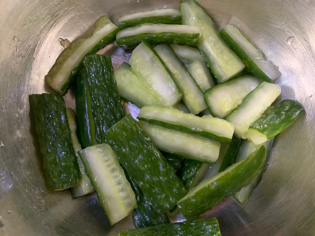 步骤4、黄瓜撒盐抓匀,放置半小时杀出水,使黄瓜变脆。然后用清水洗掉盐份,攥出备用。