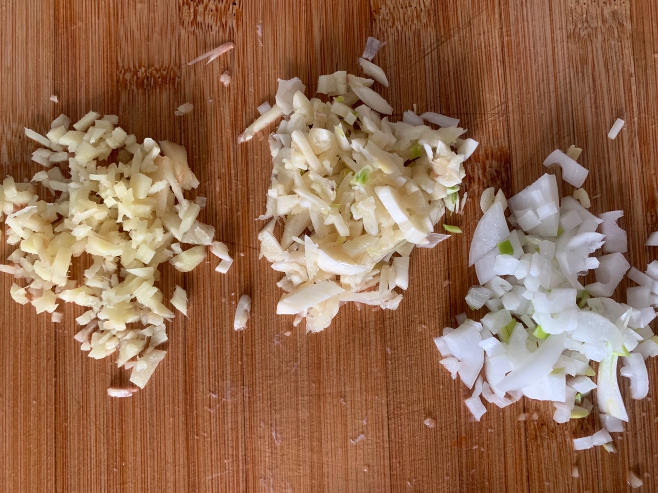 步骤6、锅底少许油烧热,倒入葱香蒜末、麻椒炒香,再倒入郫县豆瓣酱炒出红油。