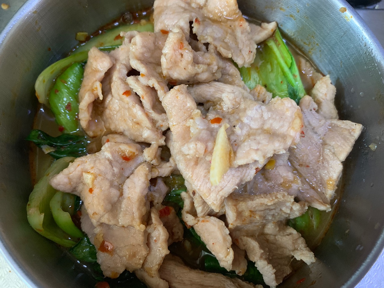 步骤9、再把腌好的肉放入锅中,打散煮熟,摆在青菜上面,倒入适量汤汁。