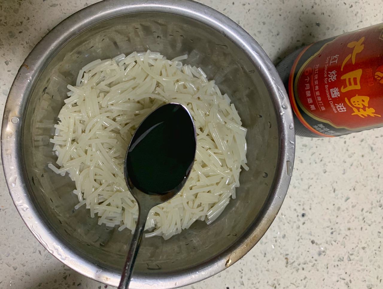 步骤4、粉丝泡软切细段,加入一勺六月鲜红烧酱油搅拌均匀上色
