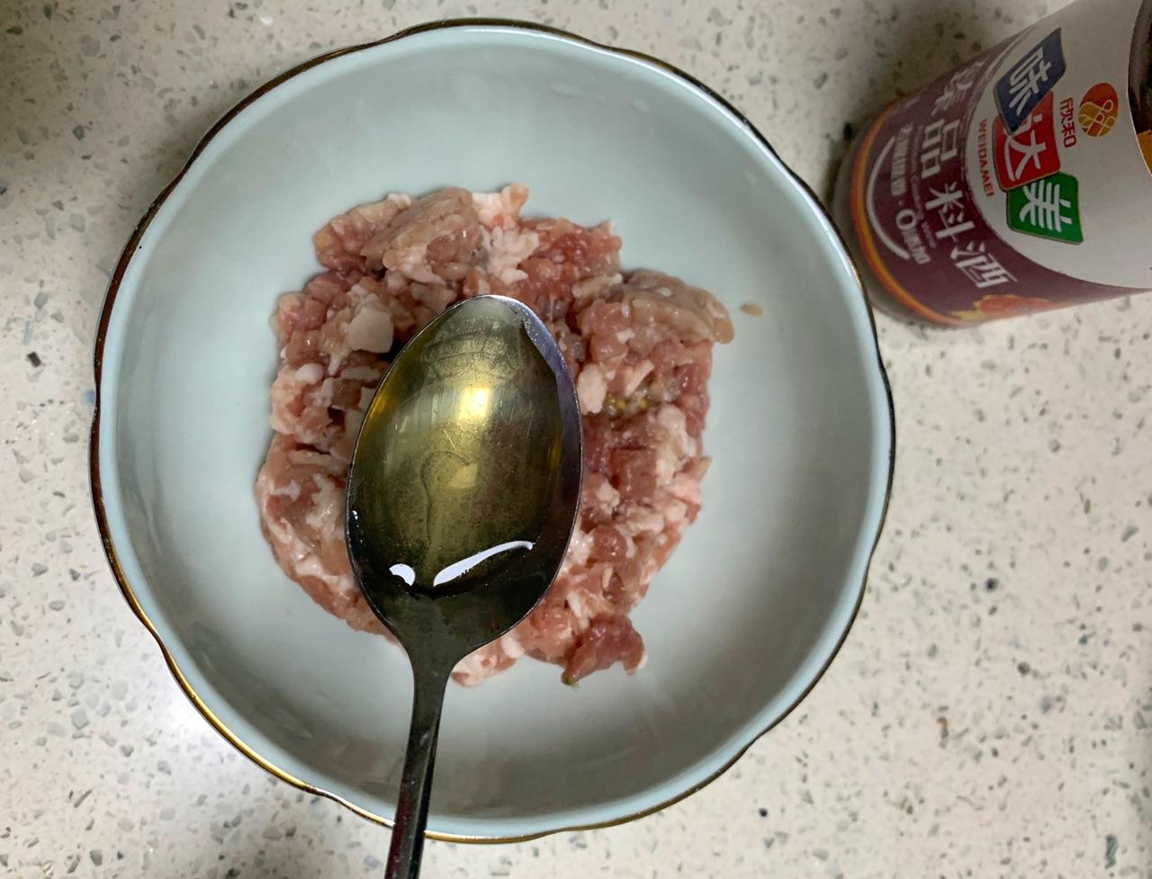 步骤5、瘦肉切细丁加入一勺味达美臻品料酒,1勺六月鲜特级酱油