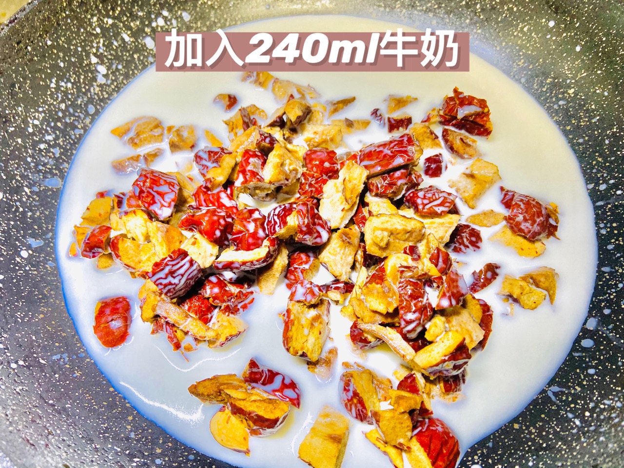 步骤3、加入240ml牛奶,大火煮开,煮到红枣变软牛奶全部被吸收