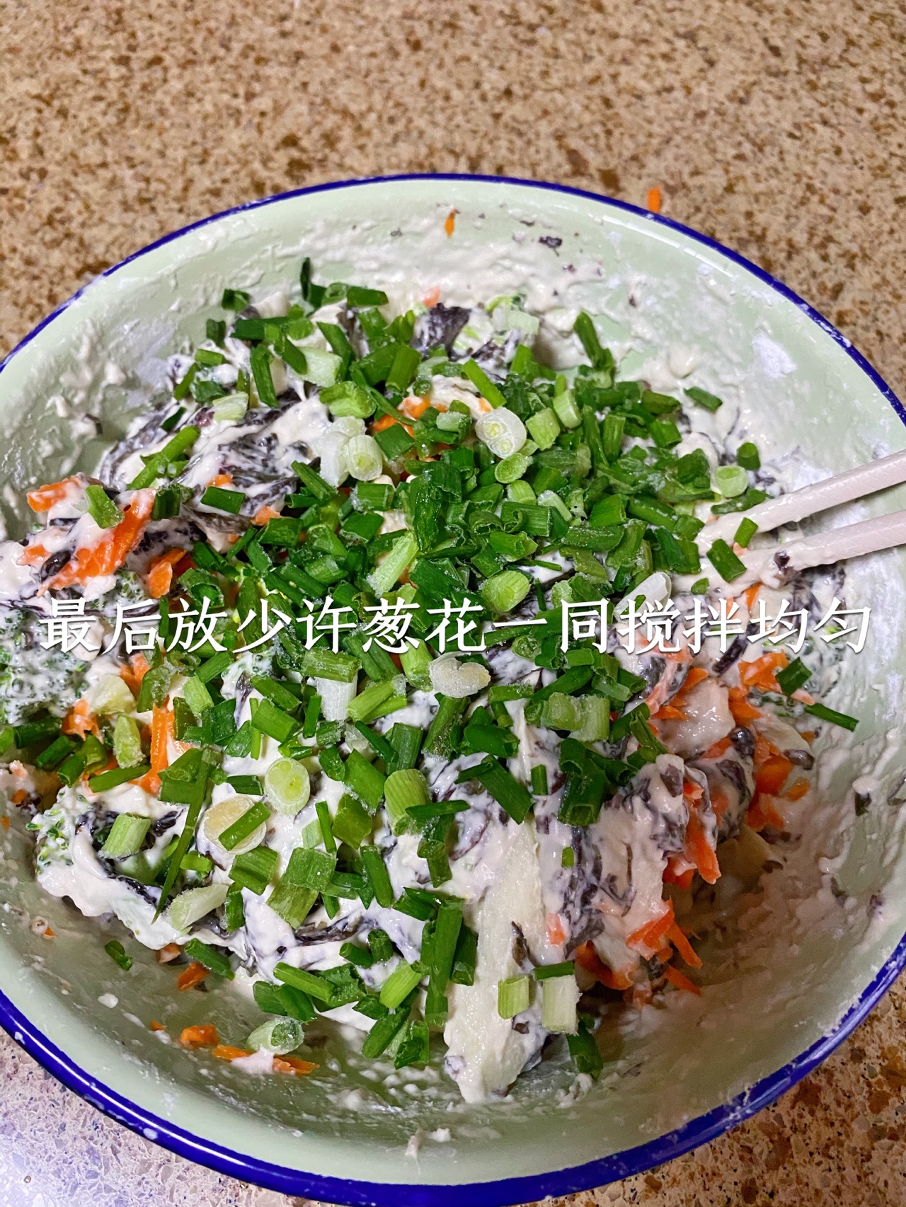 步骤4、最后放一勺盐,味精,糖加少许葱花一同搅拌均匀