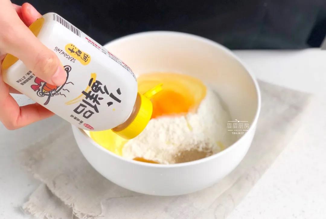 步骤3、碗中倒入80克淀粉、一小勺黑胡椒粉、打入2个鸡蛋、挤入2-3下小鲜侣调味汁;