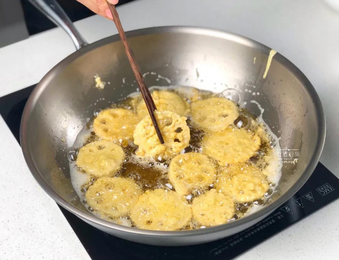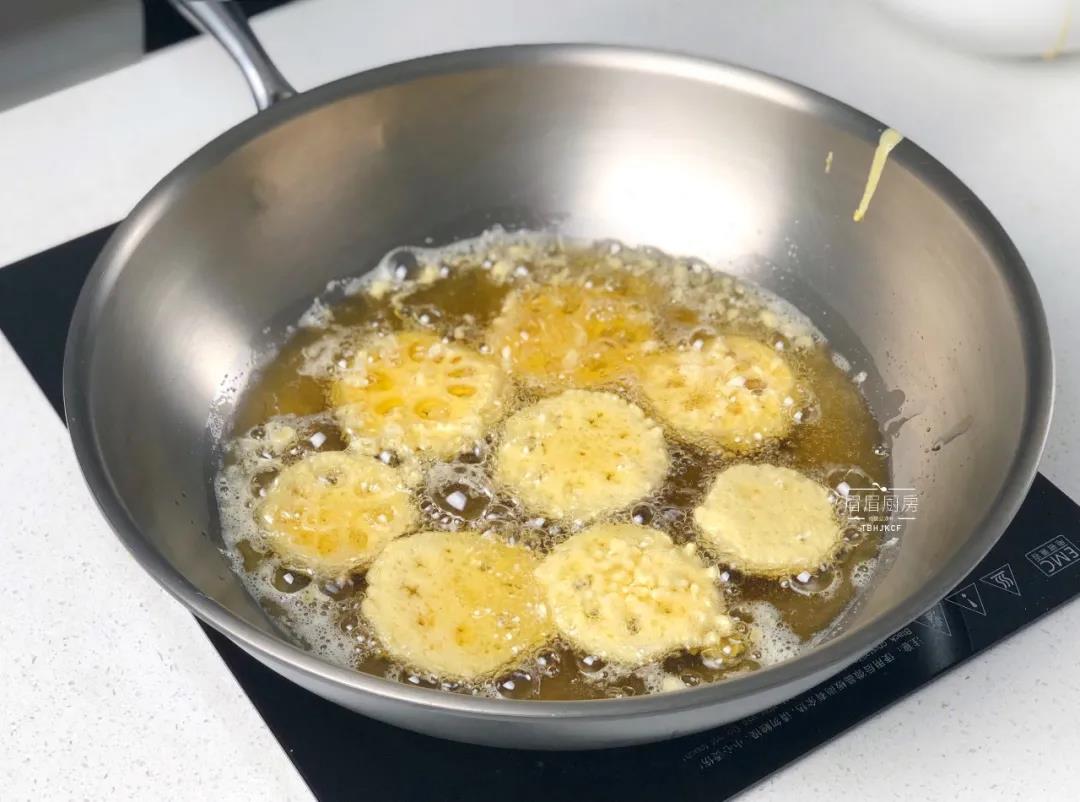 步骤8、炸至金黄酥香且藕片熟透即可;