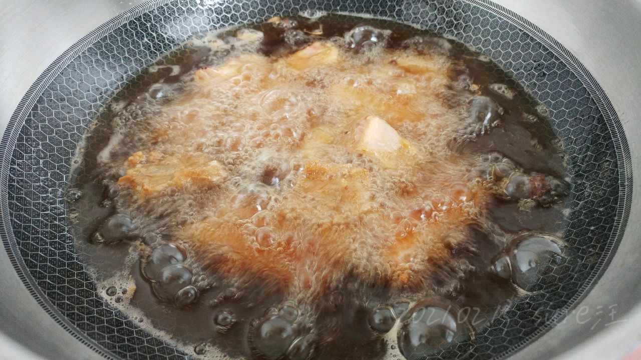 步骤6、保持油温把肉炸浮炸熟炸上色,捞出锅吸油趁热尝两块,剩下的晾凉装袋搁冷冻囤起来