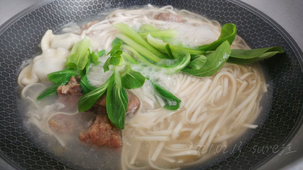 步骤10、先往碗里加点儿生抽香油盐舀几勺面汤打个底,再捞上菜面和饺子随便瞅两眼趁热吃,能吃辣的胖又可以加辣子