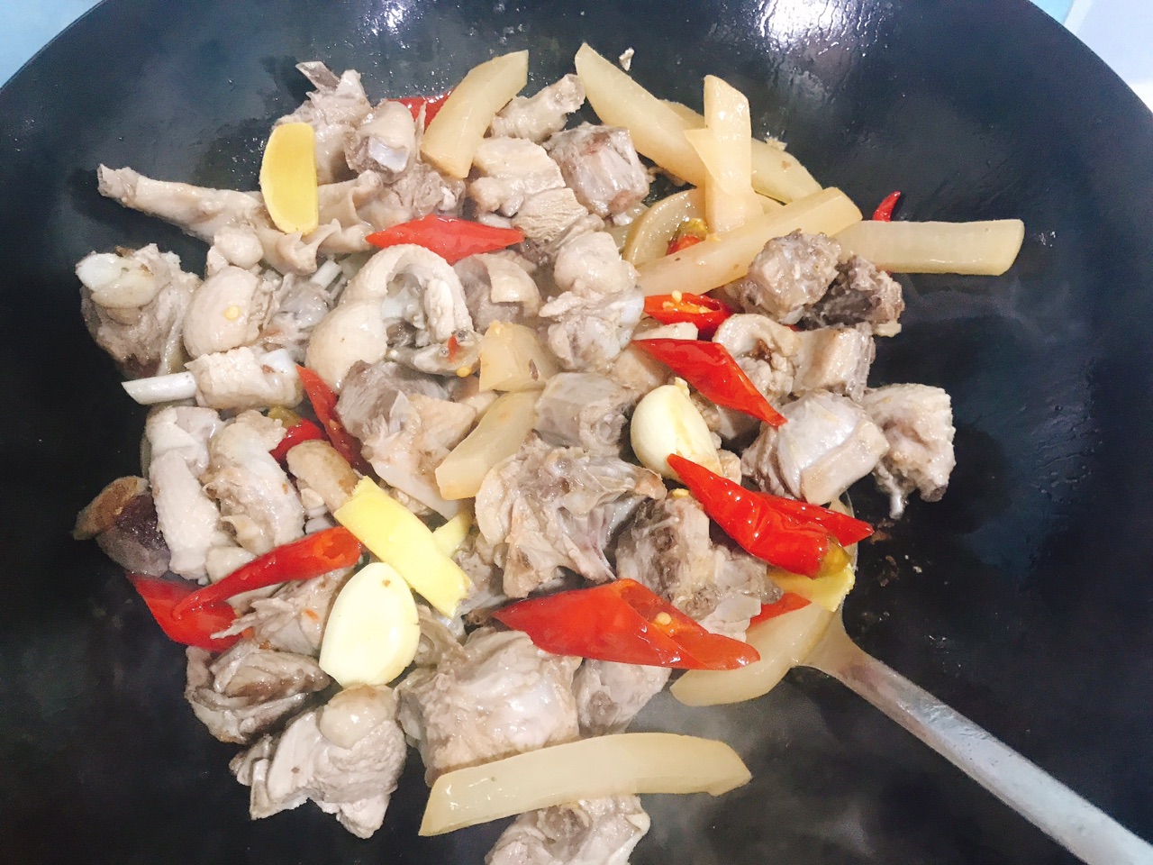 步骤13、再放入酸萝卜,泡海椒,姜,蒜炒香