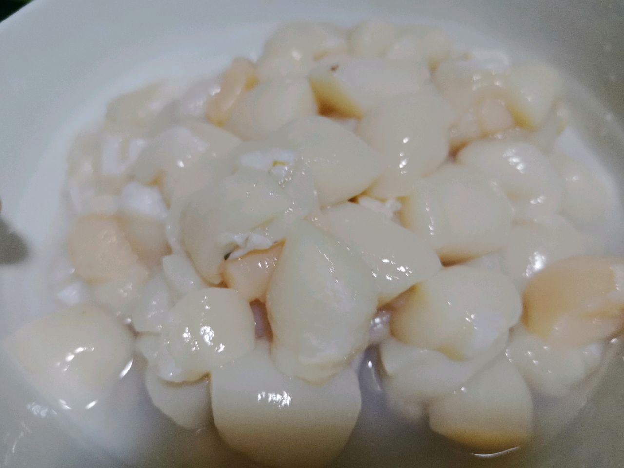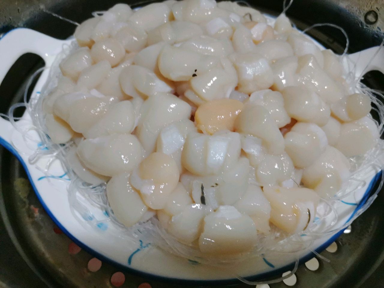 步骤6、泡好的粉丝摆在盘底,上面摆上瑶柱,放在蒸锅上