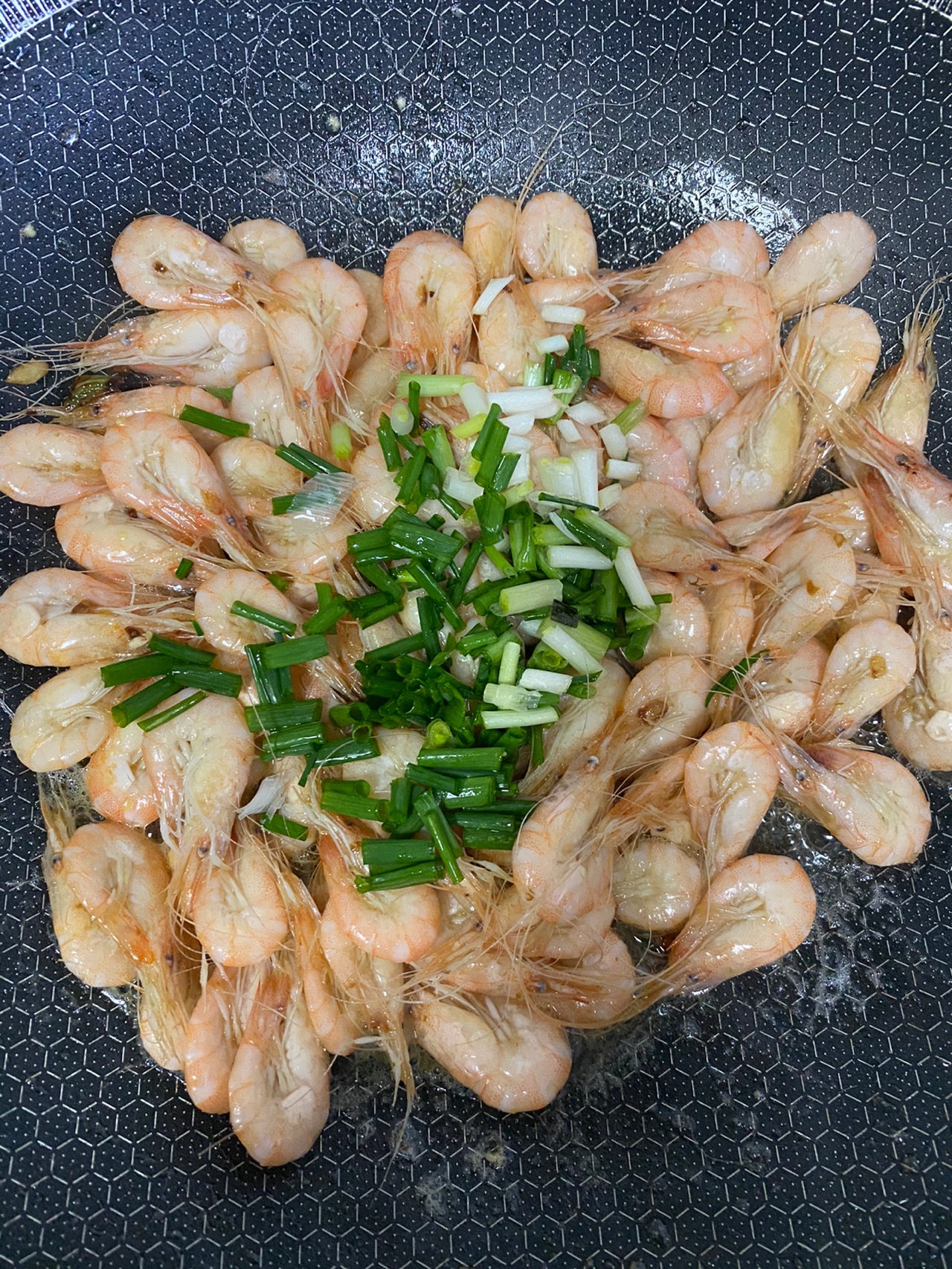 步骤5、关火用余温翻炒一下,让葱花变油润润的就可以出锅了,全程中小火估计两分钟,这样炒出来的虾嫩易去壳
