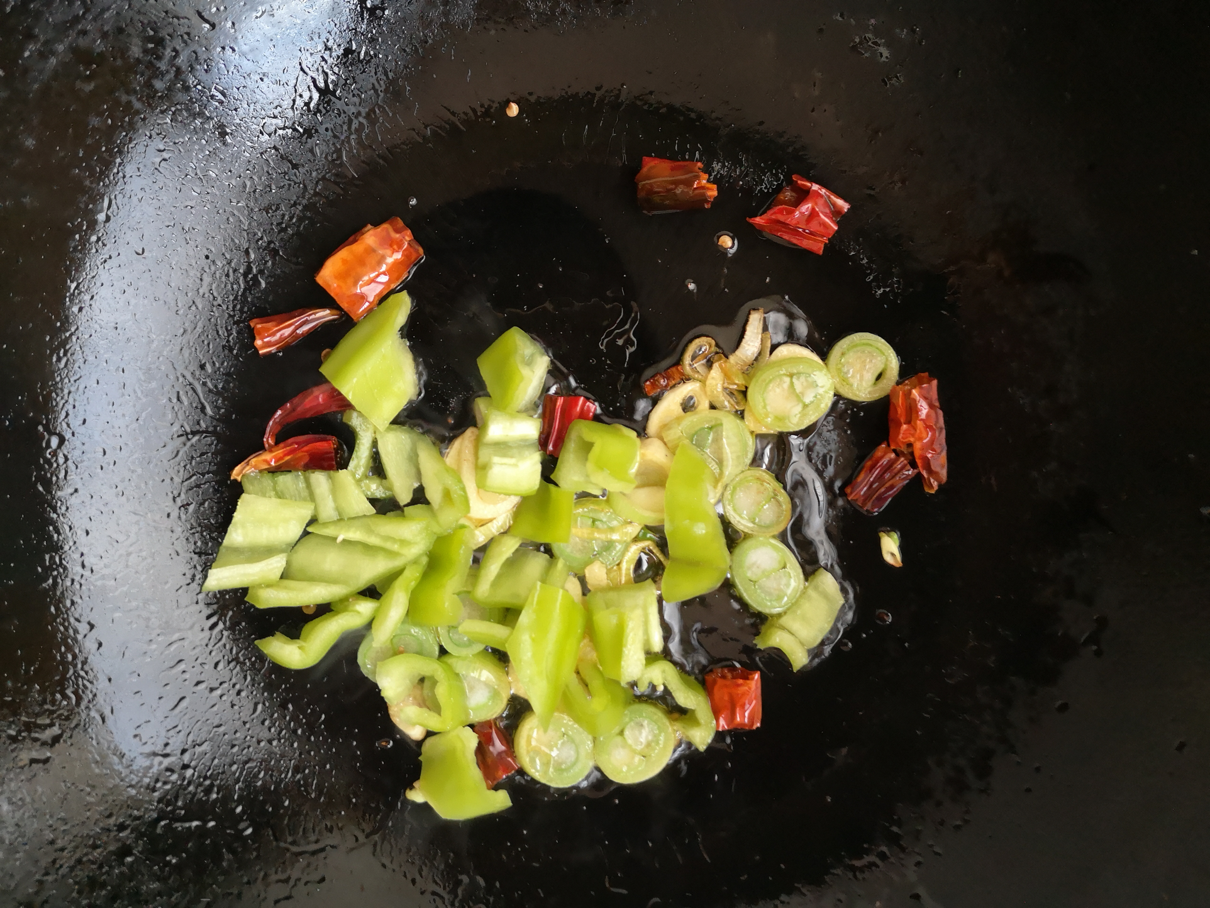 步骤2、白菜斜刀切块,青椒洗净切块,葱、蒜、干辣椒切小段。