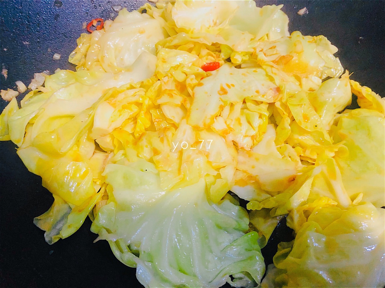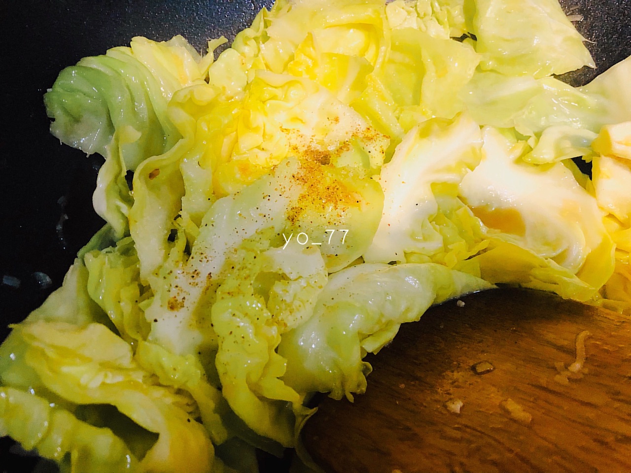 步骤3、然后倒入撕好的卷心菜,翻炒两下,倒入3勺白醋,早点放白醋蔬菜会催一点,也更的入酸味;接着倒入白砂糖个花椒粉继续翻炒两下。