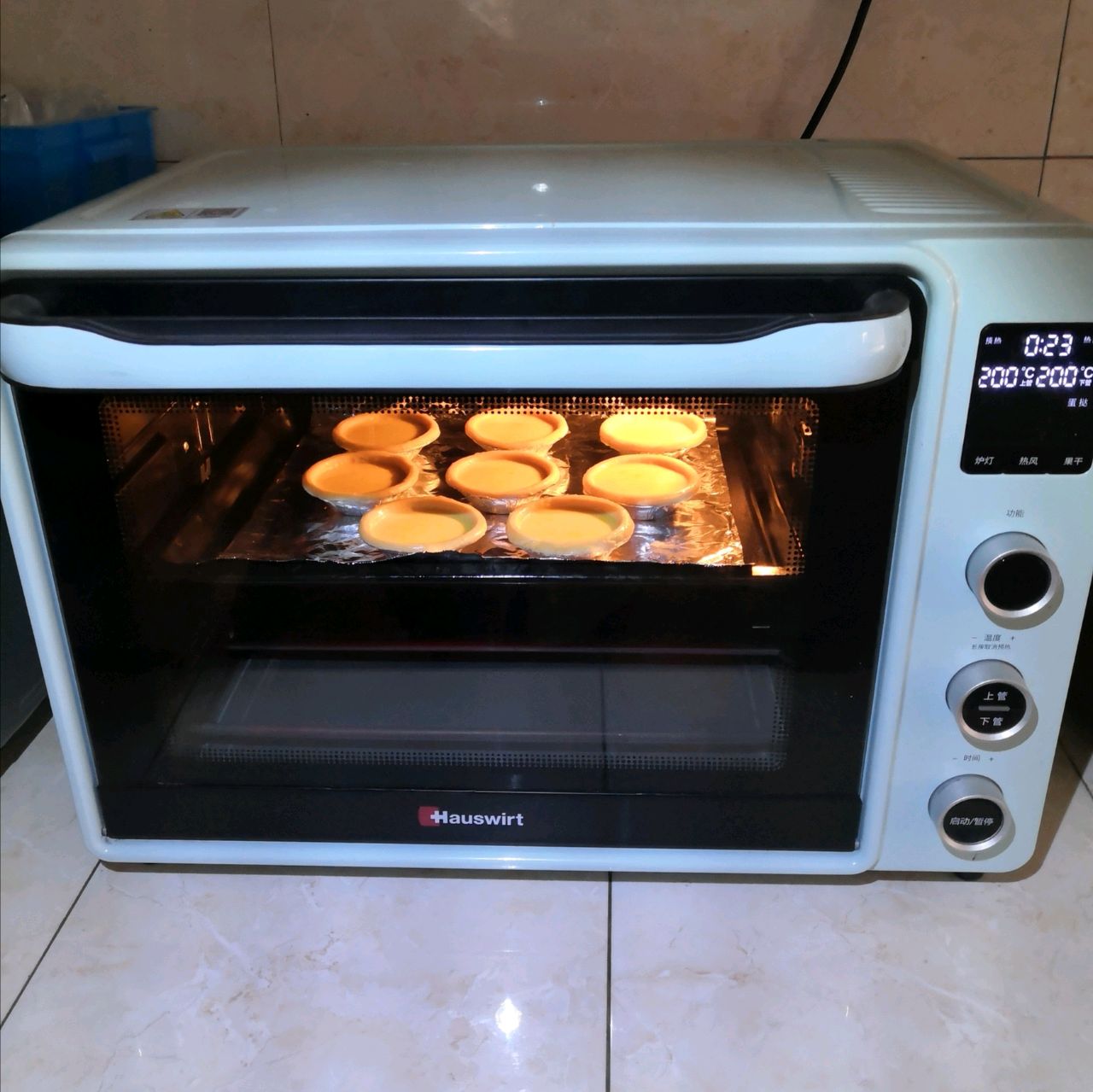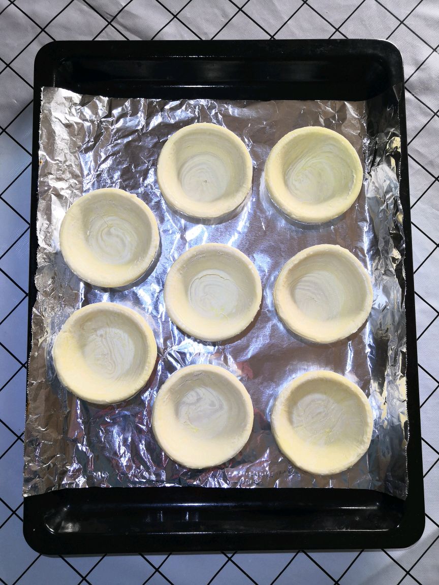 步骤1、从冰箱提前取出蛋挞皮解冻,解冻后的蛋挞皮放入铺好了锡箔纸的烤盘里。