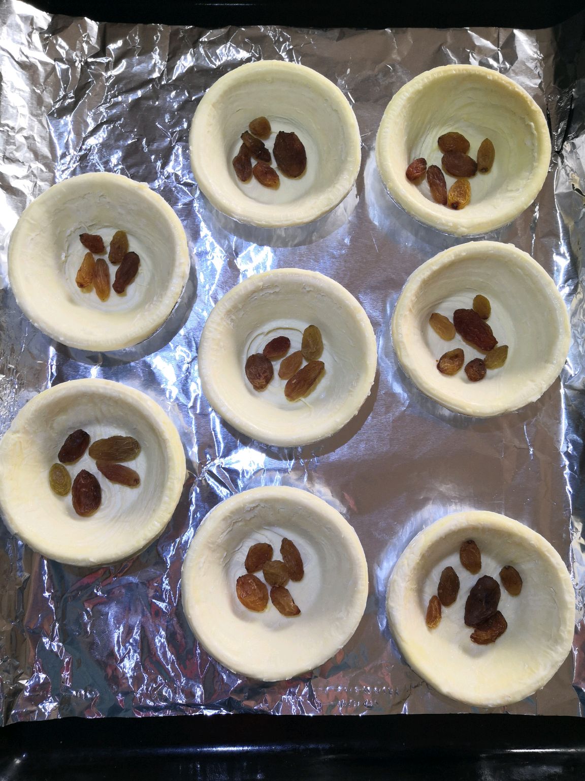 步骤2、把葡萄干放入蛋挞皮里,一个蛋挞皮里放5颗左右。烤箱200℃开始预热。