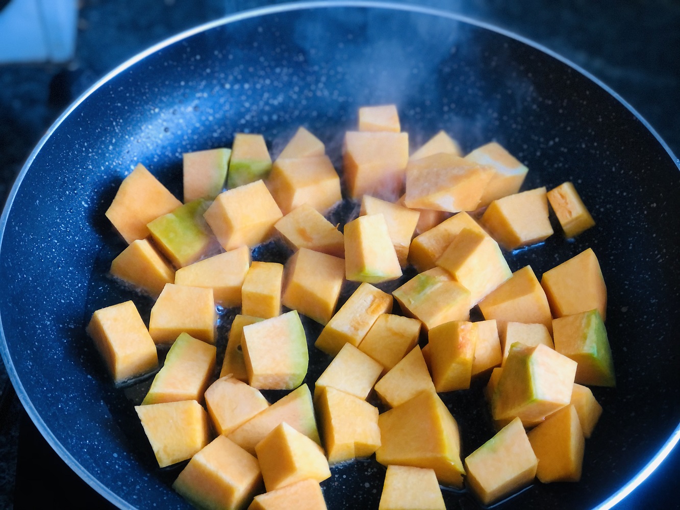 步骤8、倒入之前煎好的南瓜,翻炒均匀;