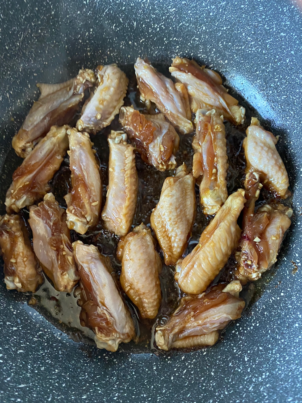 步骤2、平底锅中放入适量的油,刮去鸡翅表面的蒜末(腌制鸡翅的蒜末不要扔,滤掉料汁只留蒜末备用),中小火慢慢煎;
