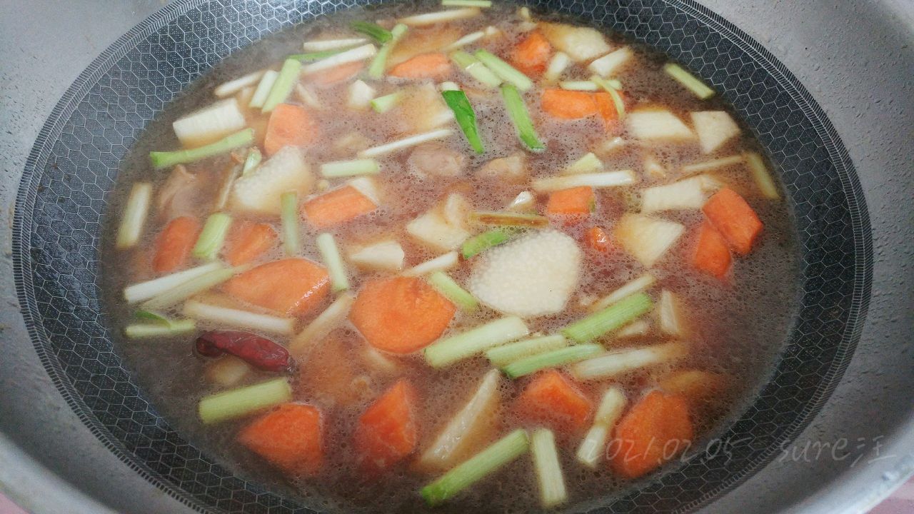 步骤4、继续划拉到蒜白挺香萝卜油润润,倒上山药加上水,基本跟所有菜块齐平那样子