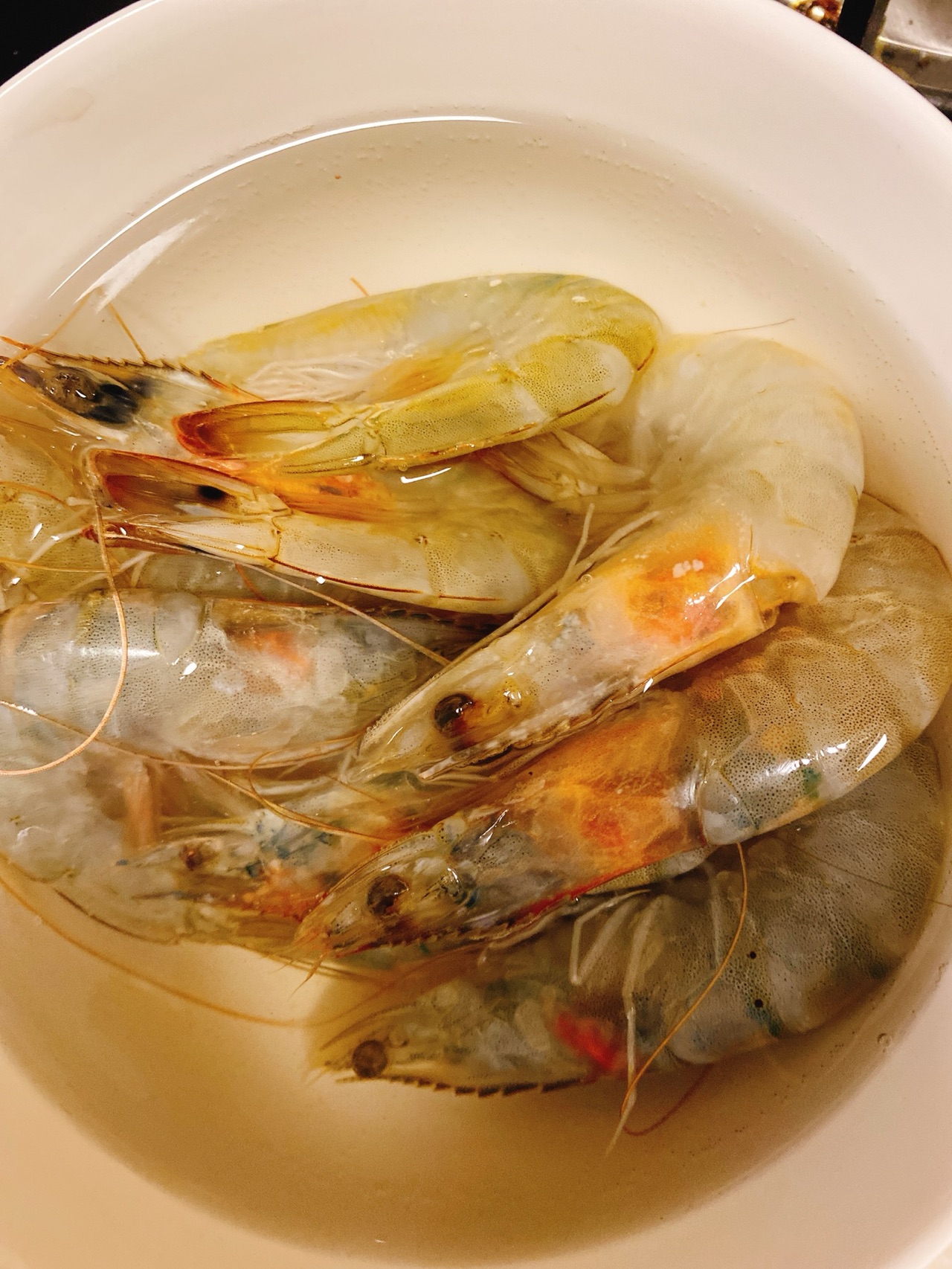 步骤1、准备:大虾,姜丝,葱花,把虾处理干净,虾头摘下,虾线挑出去虾头装碗里;把虾仁装进另一个碗里;切好姜丝和葱花;