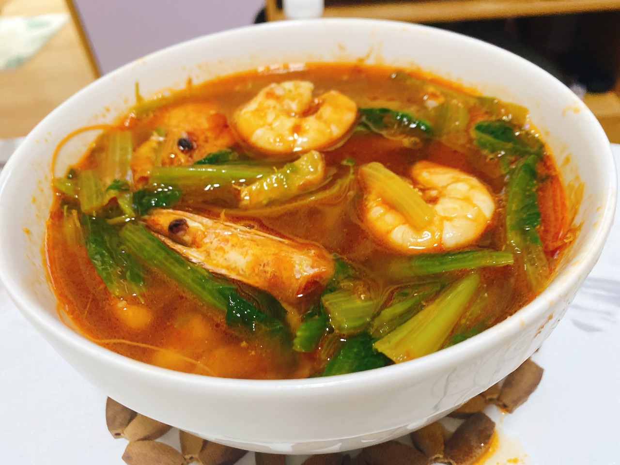 步骤2、锅里放油,先放姜丝煸炒一下,放葱花放虾头,把虾头炒一会,把虾头的红油炒出来,可以用铲子压住虾头,就可以压出虾油