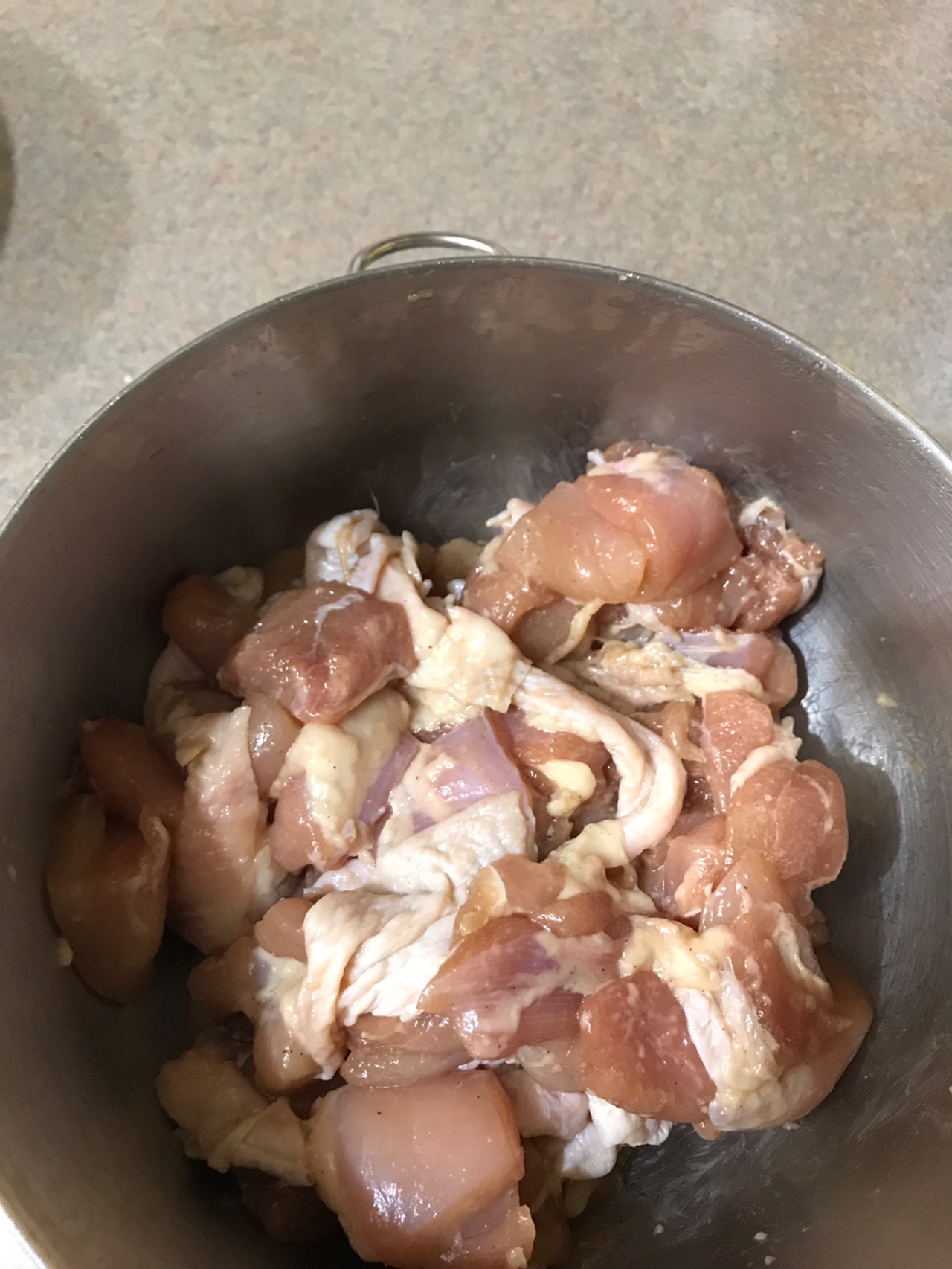 步骤1、无骨鸡腿肉切小块,加入调味料拌匀,咸淡可以自己调整,大概腌制半小时。