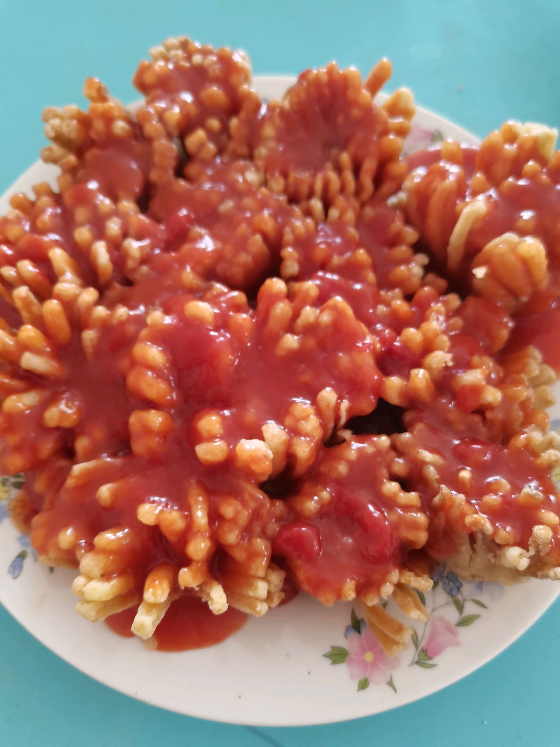 辅料:油适量汤匙、糖醋汁:、白糖30g、醋5克、水300克、玉米淀粉20克、番茄酱60克