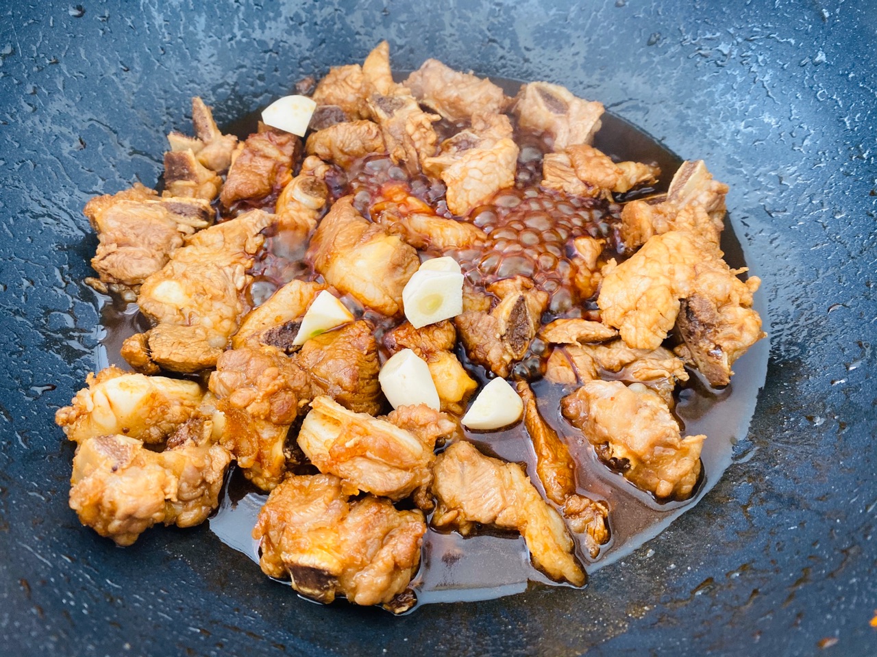 步骤6、把焯水后的排骨放进去翻炒;