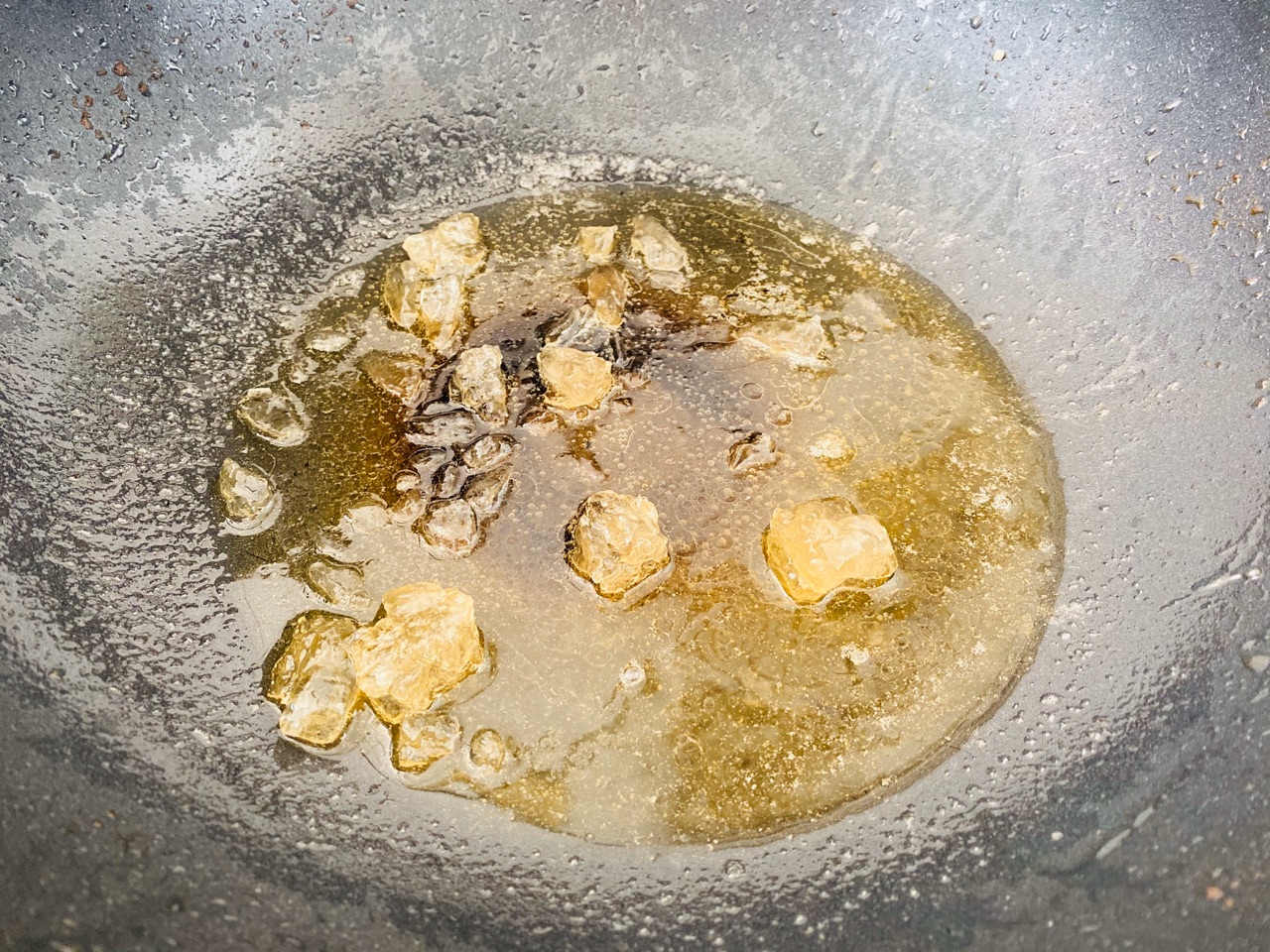 步骤5、待糖融化糖色呈金黄色泽,起密集的大气泡,糖就炒好了,糖炒成焦糖色菜品可能会有苦味噢;