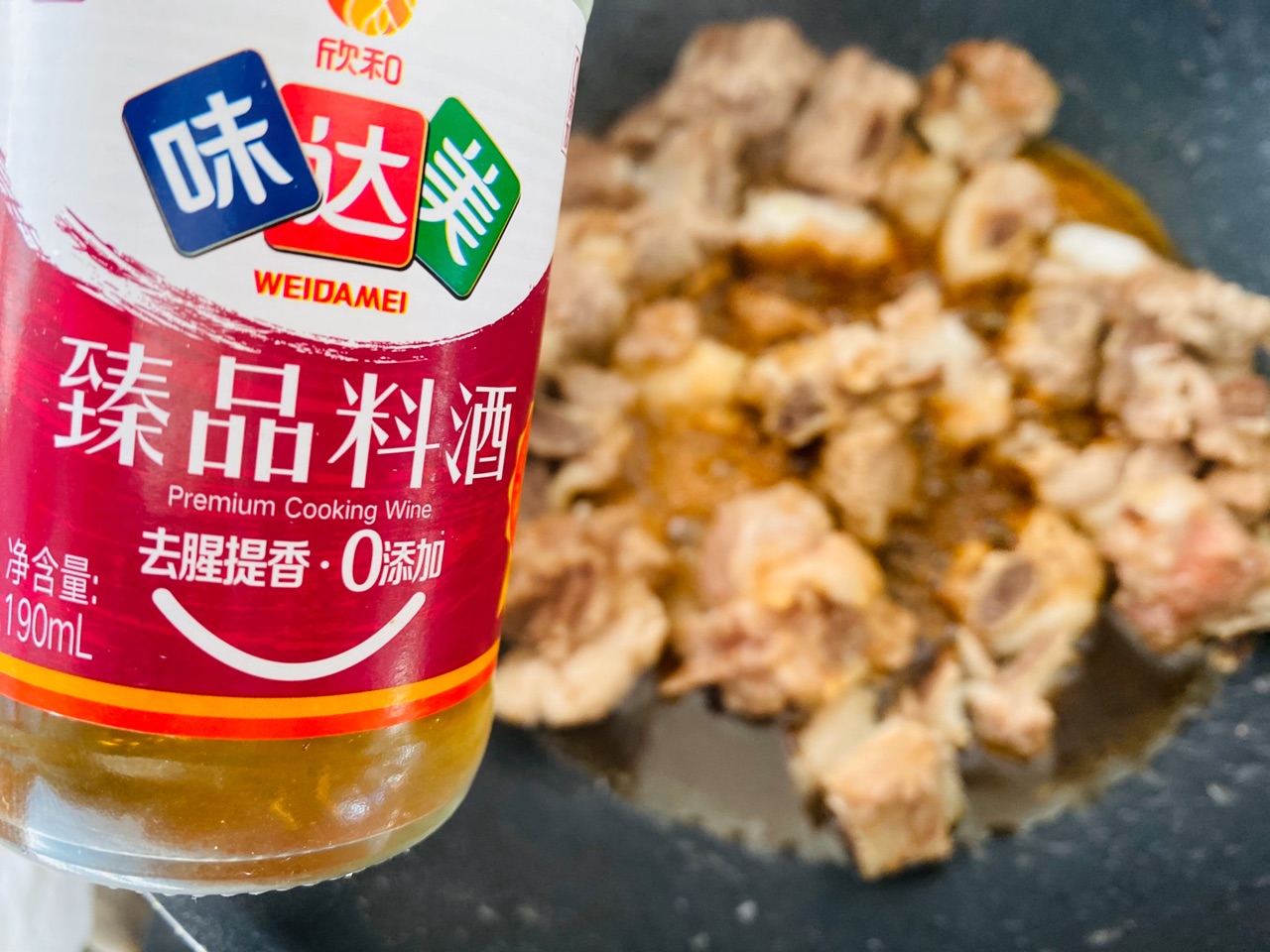 步骤9、倒入两勺料酒;