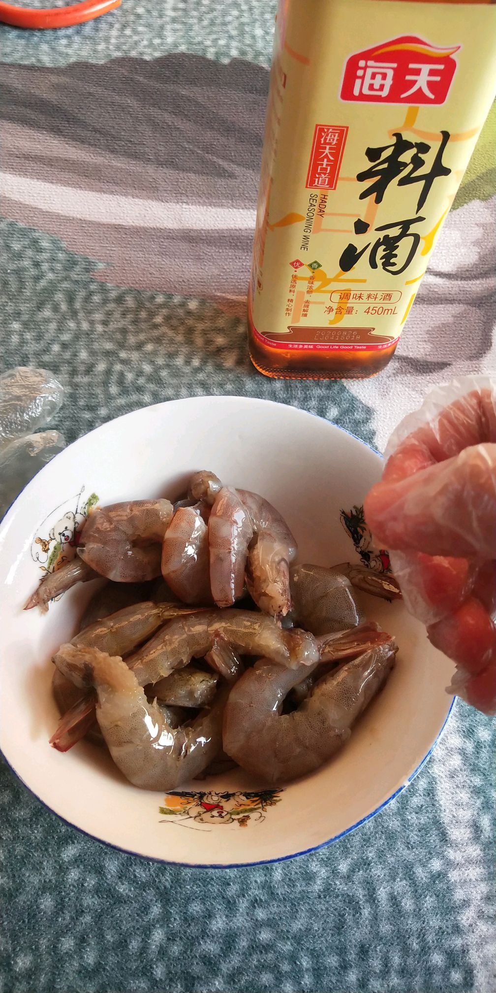 步骤1、将大虾洗净,挑好虾线,放入料酒、食盐腌制一会,去去大虾的腥味(最好戴上塑料手套,用手抓匀)