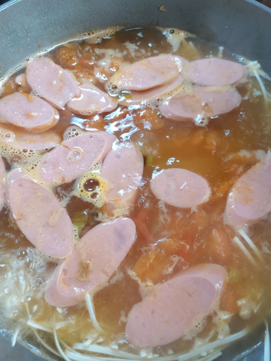 辅料:盐1勺、酱油1小勺、香醋1小勺、胡椒粉少许、香油少许、鸡蛋2个、葱花适量、火腿肠1根、西红柿1个