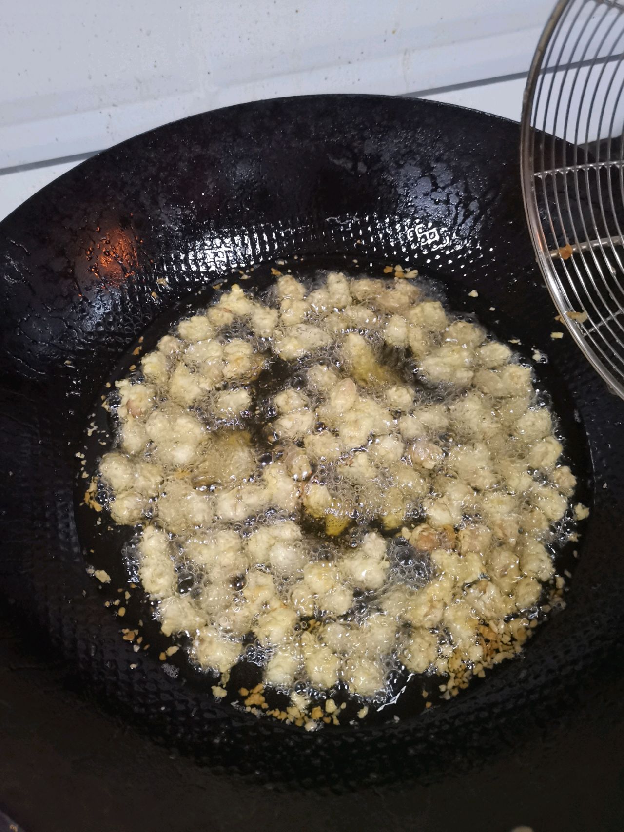 步骤4、热锅,入油,油热后下去花生炸至金黄盛盘备用