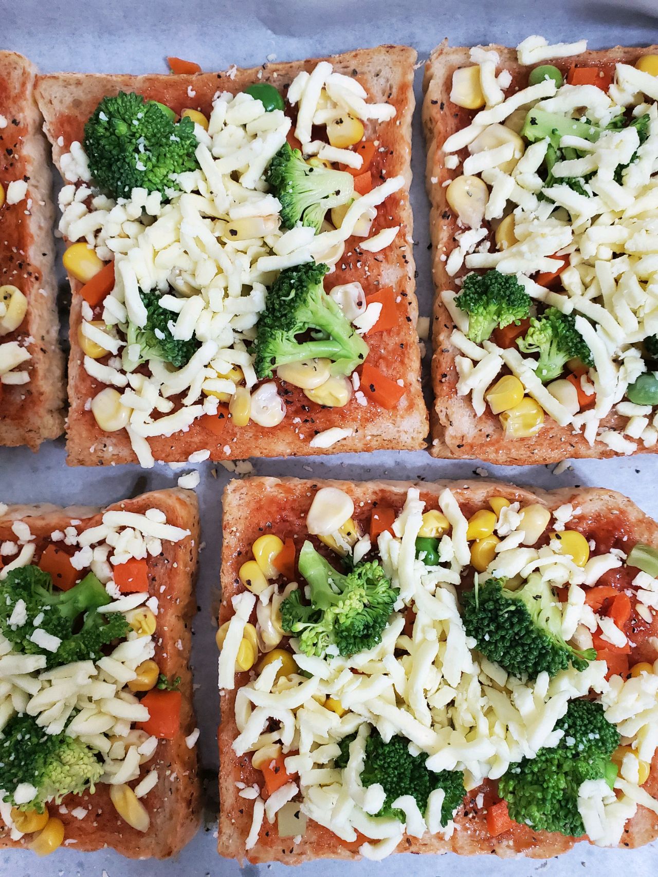 辅料:马苏里拉奶酪适量、青豆适量、胡萝卜丁适量、西蓝花适量、披萨草适量、番茄酱适量、黑胡椒适量