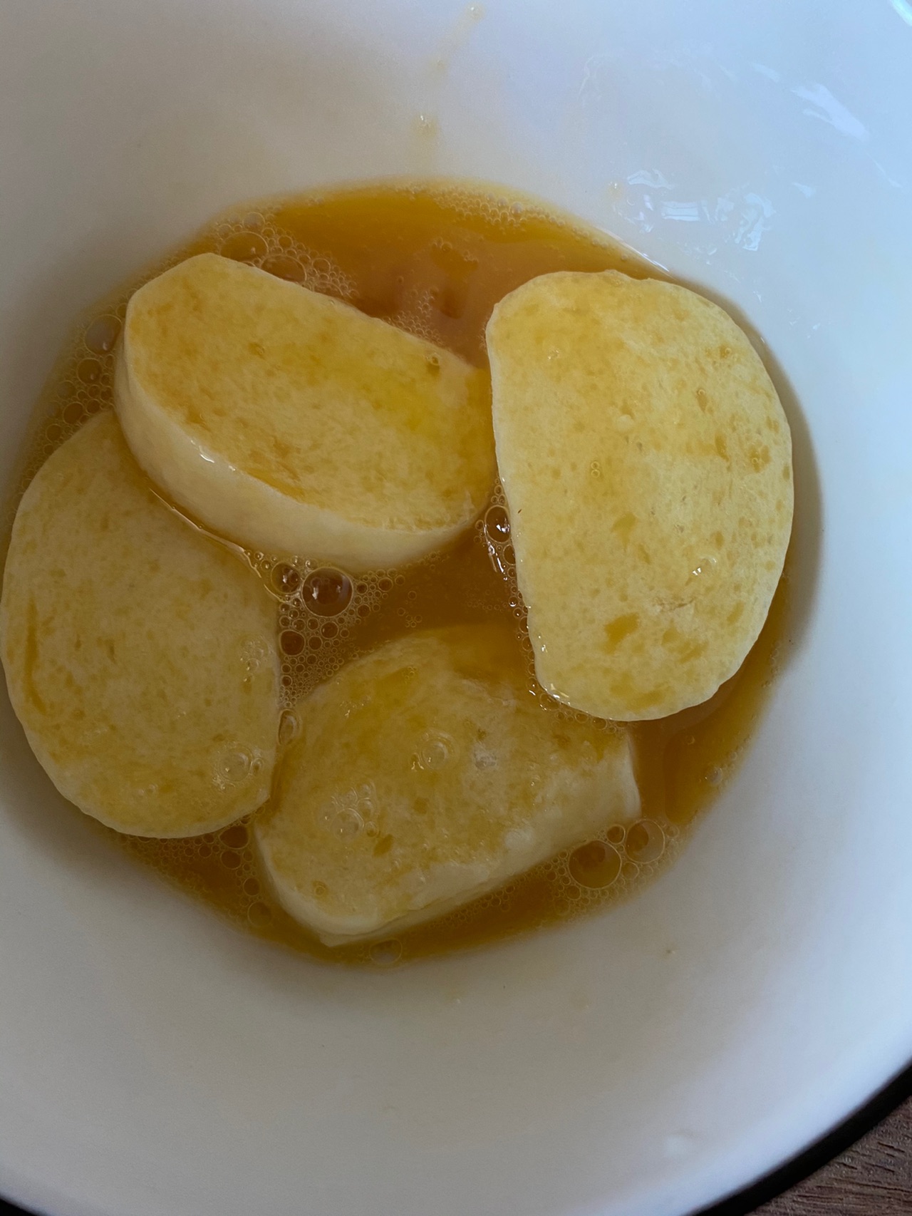 步骤4、放入鸡蛋液中,两面都沾上鸡蛋液。