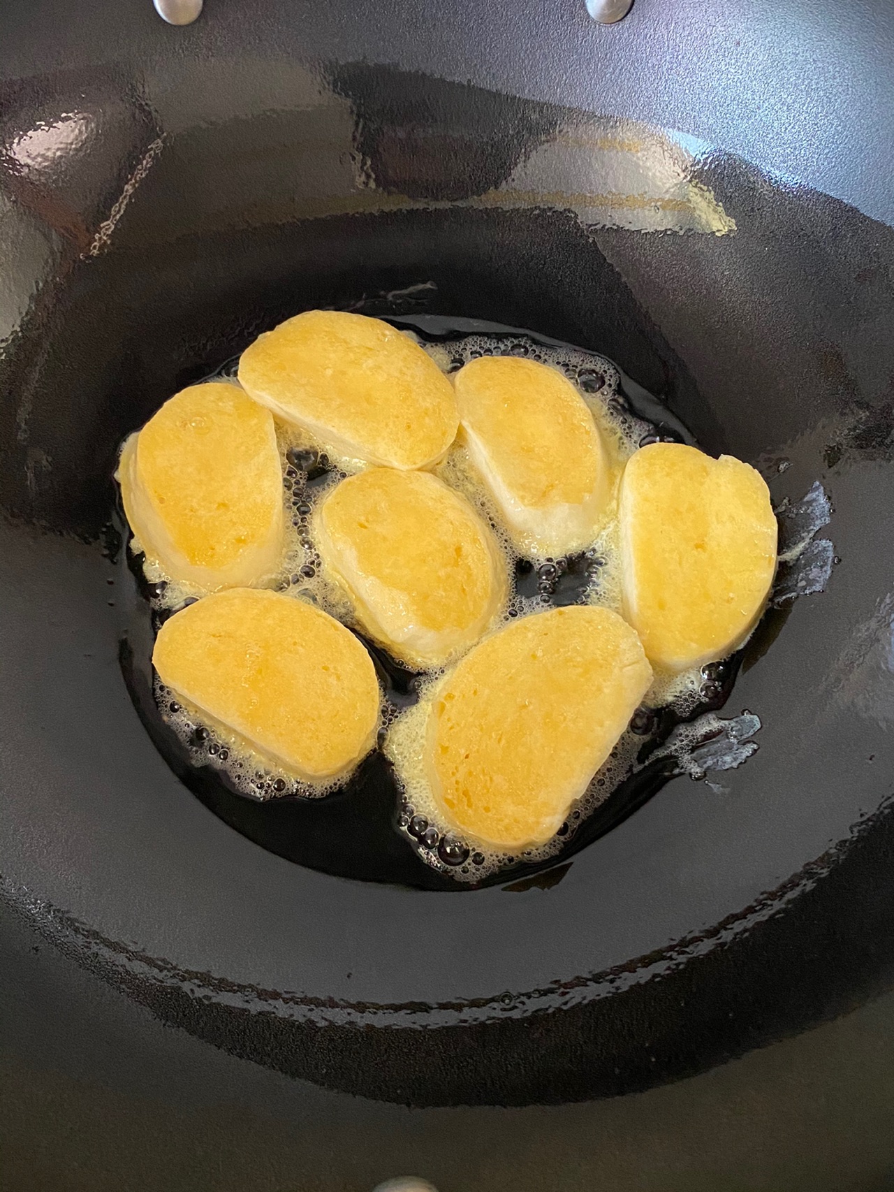 步骤5、锅中倒入食用油,放入馒头片,小火慢煎至两面金黄色即可。