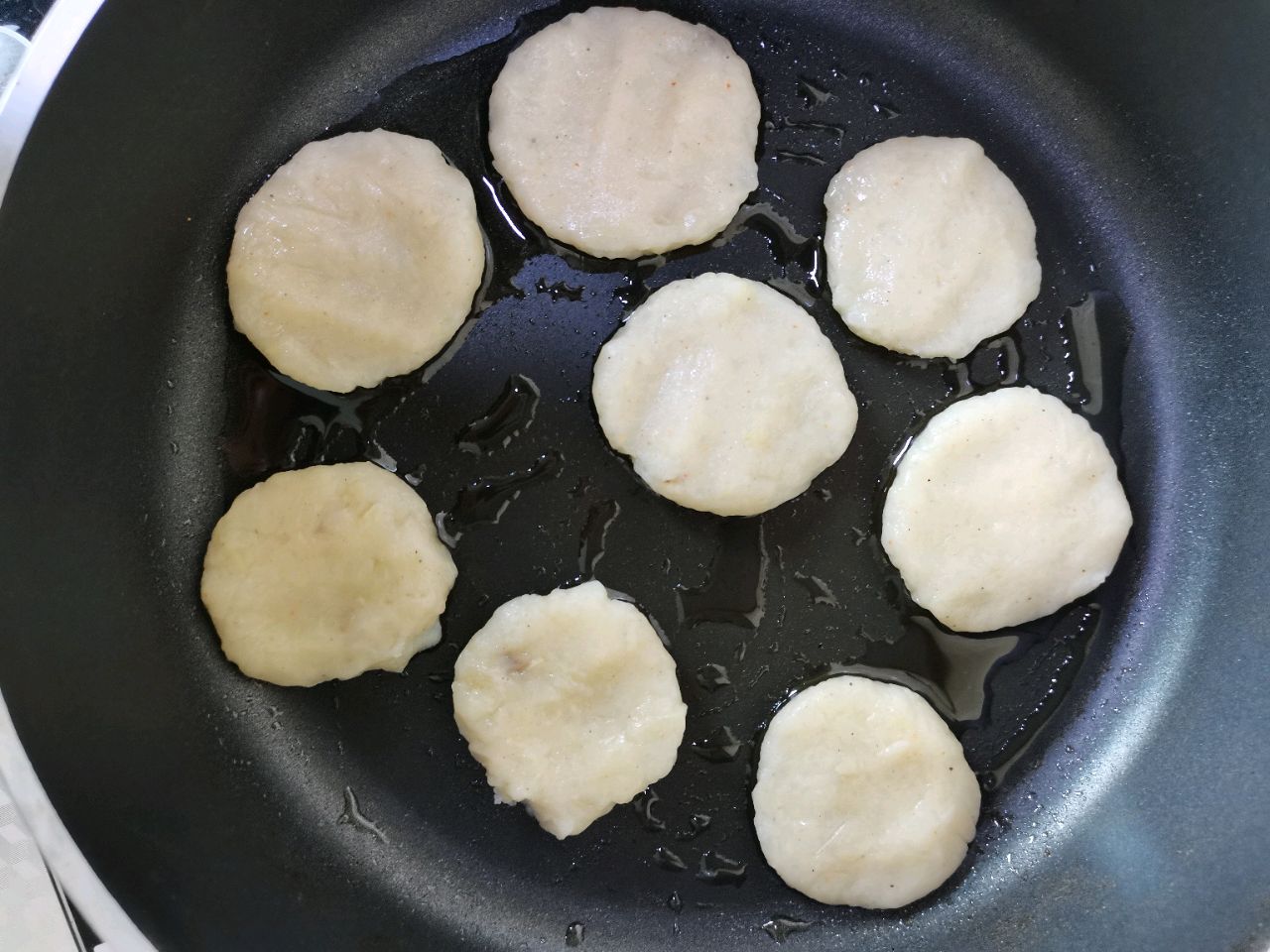 步骤4、中小火开始煎,别急着翻面太软不好翻面,两面煎至金黄就可以了