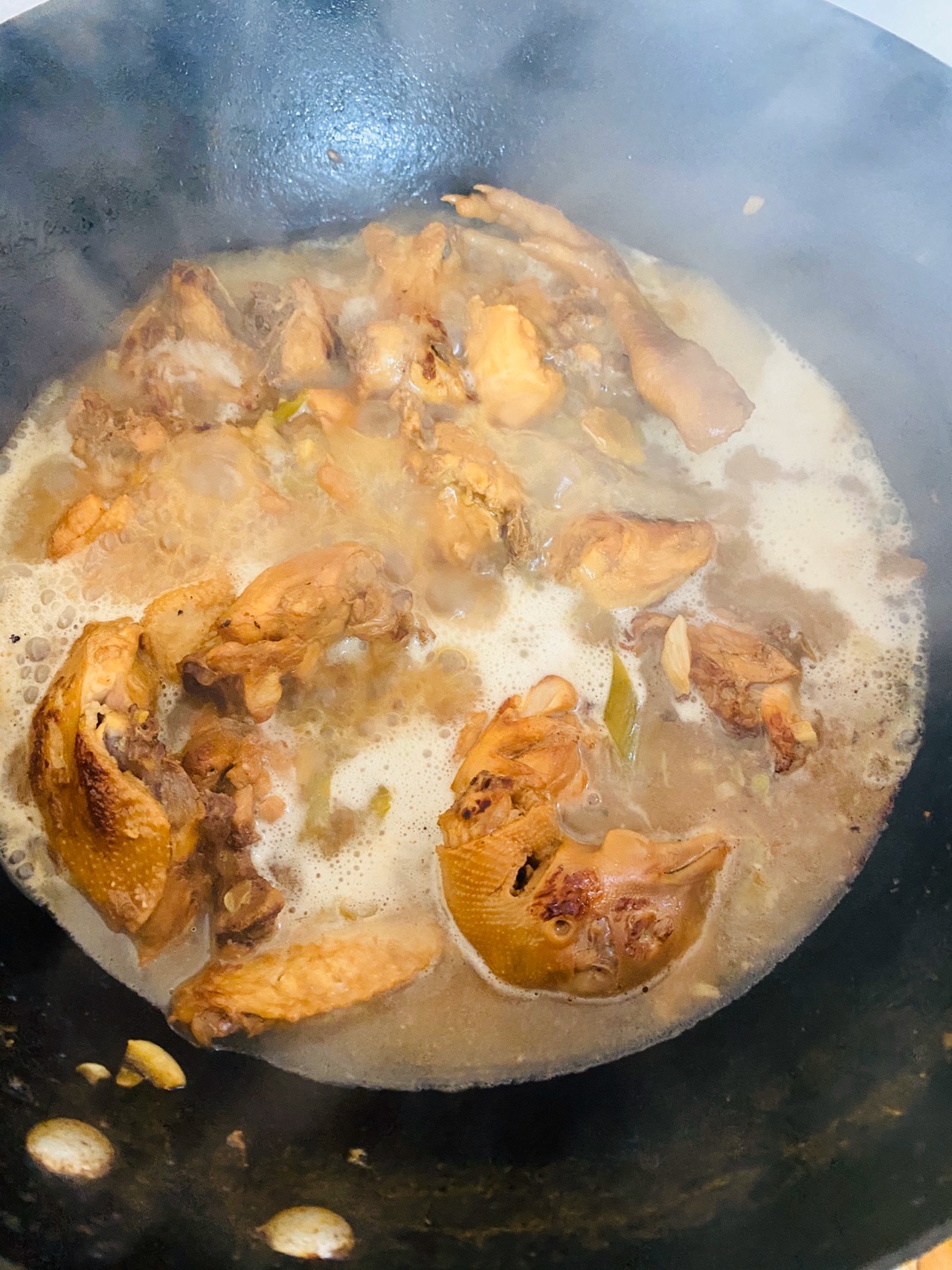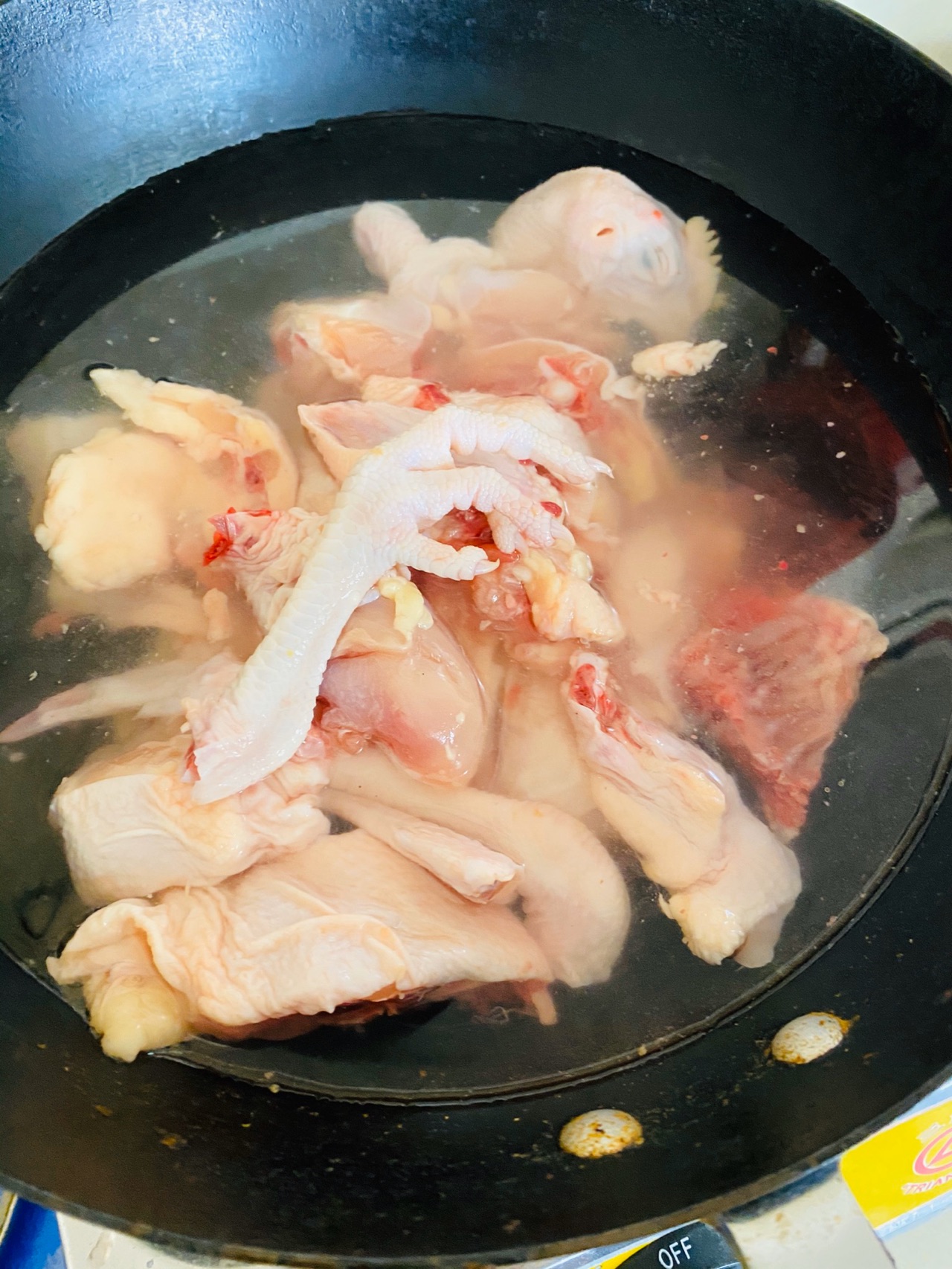 辅料:姜1块、花椒1匙、八角3颗、油3勺、盐1勺、整鸡一只