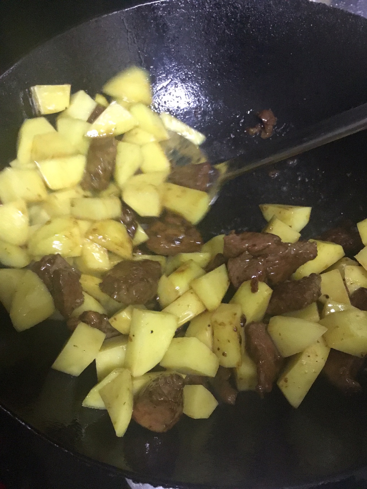 步骤5、油锅热好,放入白砂糖,小火熬至起沙,千万不要起大泡,马上把牛宝宝丢进锅里,翻至变色均匀,马上把小土豆们也踹进锅里,让糖汁挂匀它们表面,不要停,继续翻炒