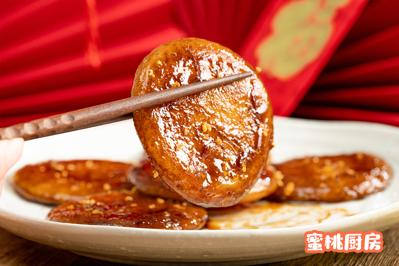 步骤5、往锅中倒入调好的红糖水煮至收汁,边煮边翻面,以防粘锅