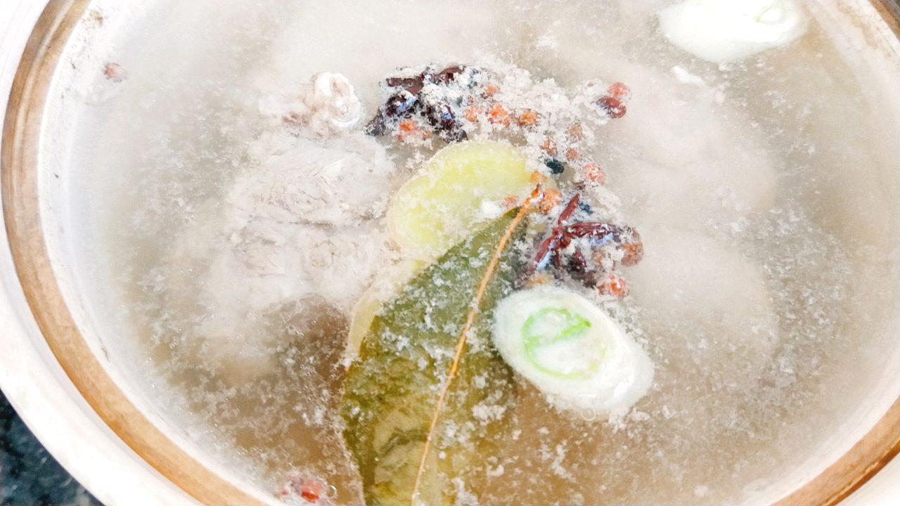 步骤6、将肉洗净入砂锅,加水冷水没过肉,烧开后撇去浮末,倒入2勺料酒,加入姜片,葱段,花椒八角,桂皮,香叶,红椒,小火焖煮半小时。
