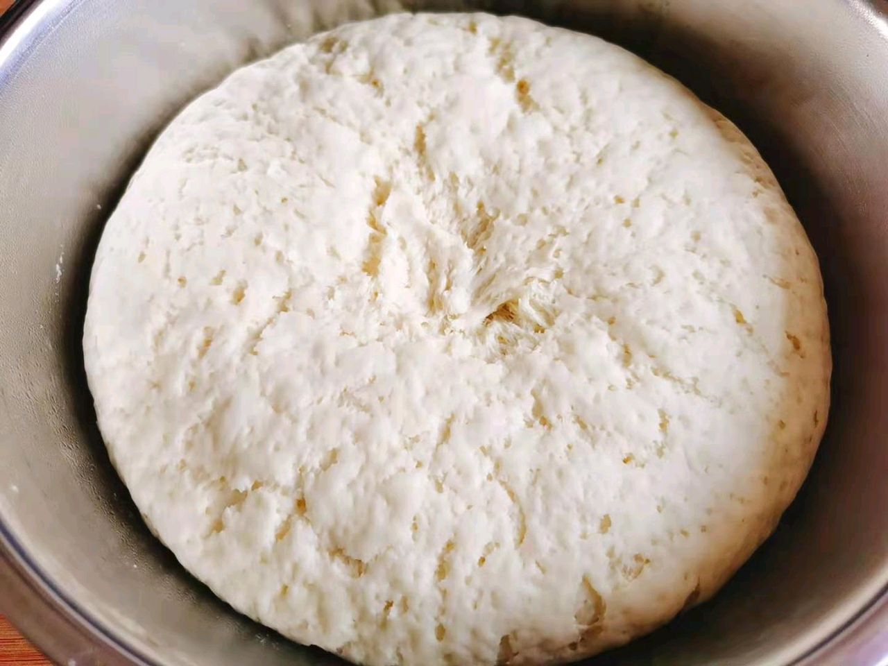 步骤4、加入水,牛奶揉成光滑的面团,盖上保鲜膜放在温暖处发酵。
